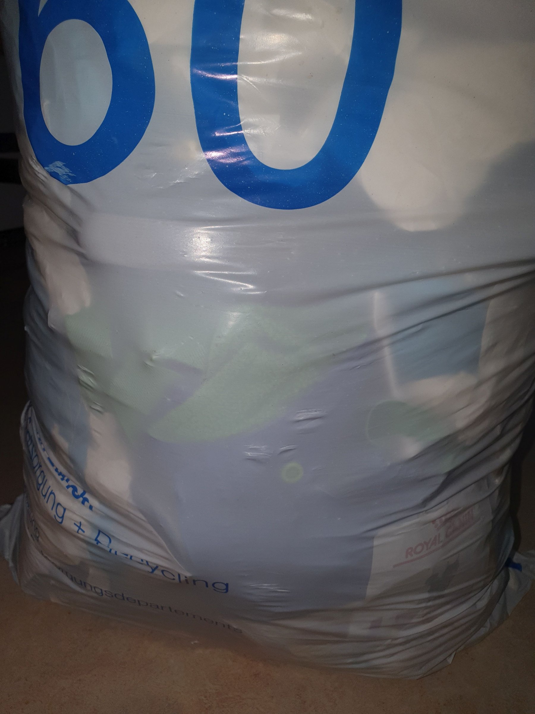 Man kann durch den Sack sehr gut erkennen, dass auch ein Gummistiefel dort drin liegt.
