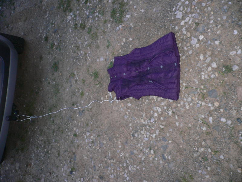 Ich hing sie kurzer Hand an mein Auto und fuhr ein paar Meter mit ihr. Das tat ihr schon ein aar Schäden hinzufügen. Besonders die Reisverschlüsse und Druckknöpfe litten sehr.