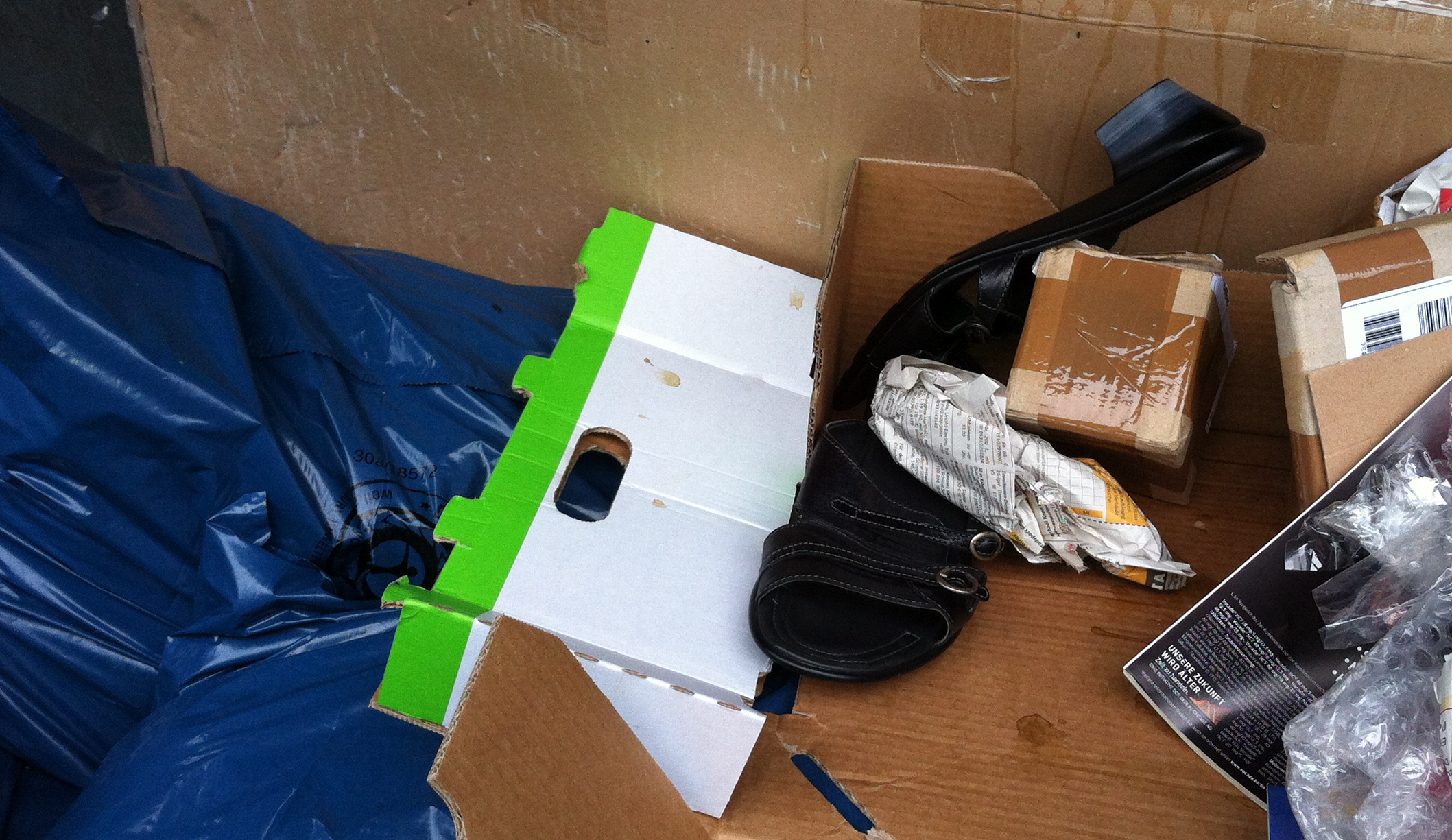 Hier zwei Fotos von einem Paar Schlappen, die keine Stunde alt geworden sind. Eine Angestellte hat sie sich gerade gekauft, ist mit ihnen umgeknickt und hat sie wutentbrannt, weil was abgerissen war, in den Papierkorb gestopft. Schnelles Foto - daher unscharf. Dann wanderten sie auch schon in den Container und von dort ging es nach 5 Minuten in den Müllwagen. Keine Rettung möglich. Diese Riesenfrau trägt Schuhgröße 43-44.