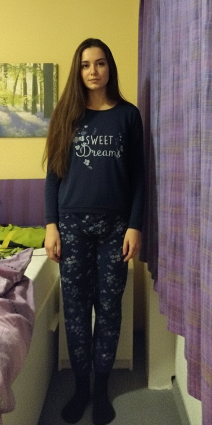 KI Bild wie die Vorbesitzerin mit ihrem Pyjama ausgesehen haben könnte.