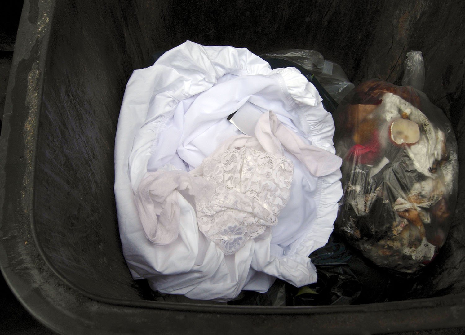 Diverse Klamotten warten darauf vom Müllwagen verschlungen zu werden. Für den Minirock und den BH ist die Sache noch einmal gut ausgegangen, den Rest holte die Müllabfuhr.