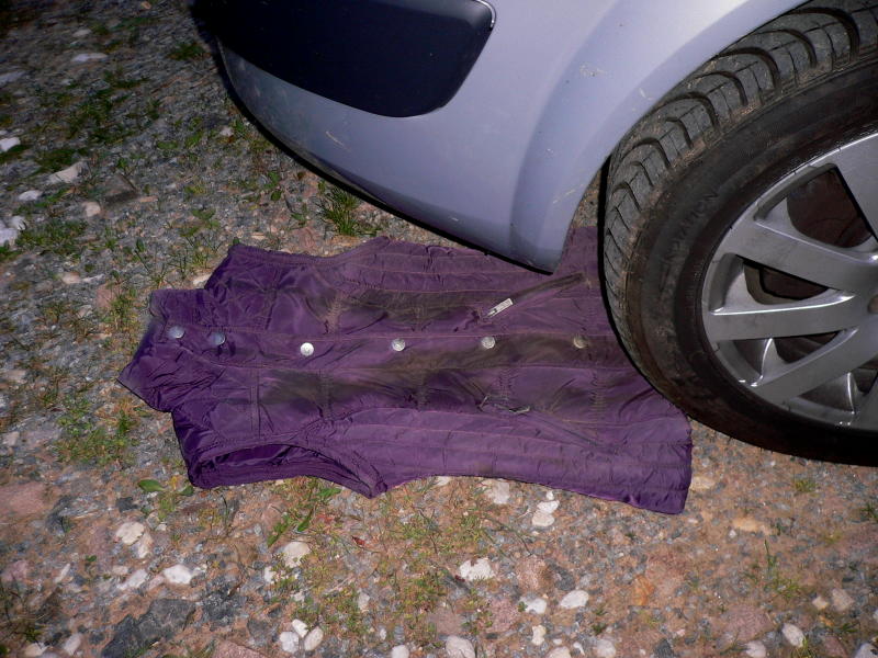 Ich hing sie kurzer Hand an mein Auto und fuhr ein paar Meter mit ihr. Das tat ihr schon ein aar Schäden hinzufügen. Besonders die Reisverschlüsse und Druckknöpfe litten sehr.