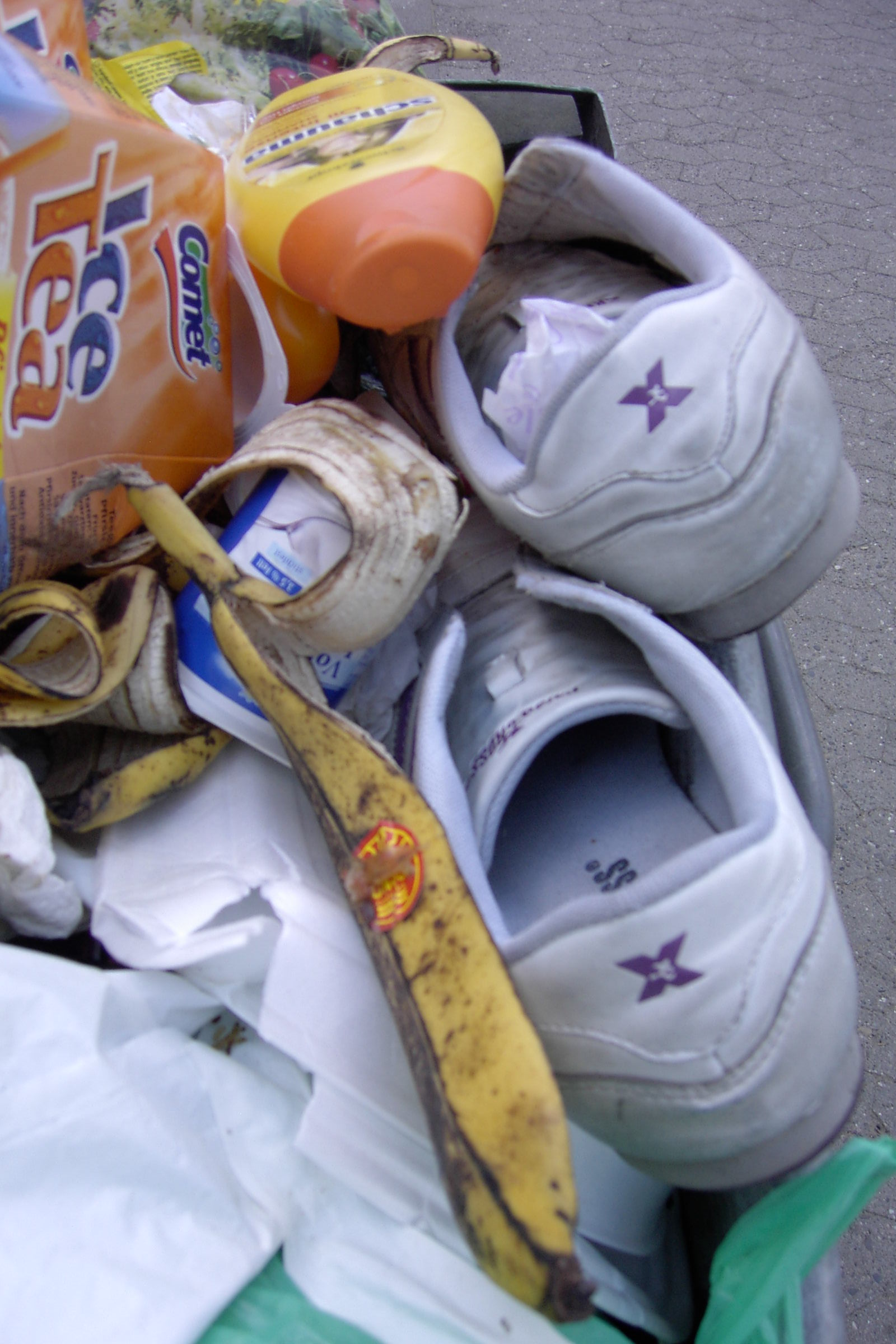 Hier die Schuhe von einer etwas runtergekommenen Asso-Tussi, die ihre stinkigen Sneakers in einem nachlässig verschlossenen Küchenmüllbeutel entsorgt hat und damit an mir schnurstraks in Richtung Müllboxen gelaufen ist. Hier der geile Fund: