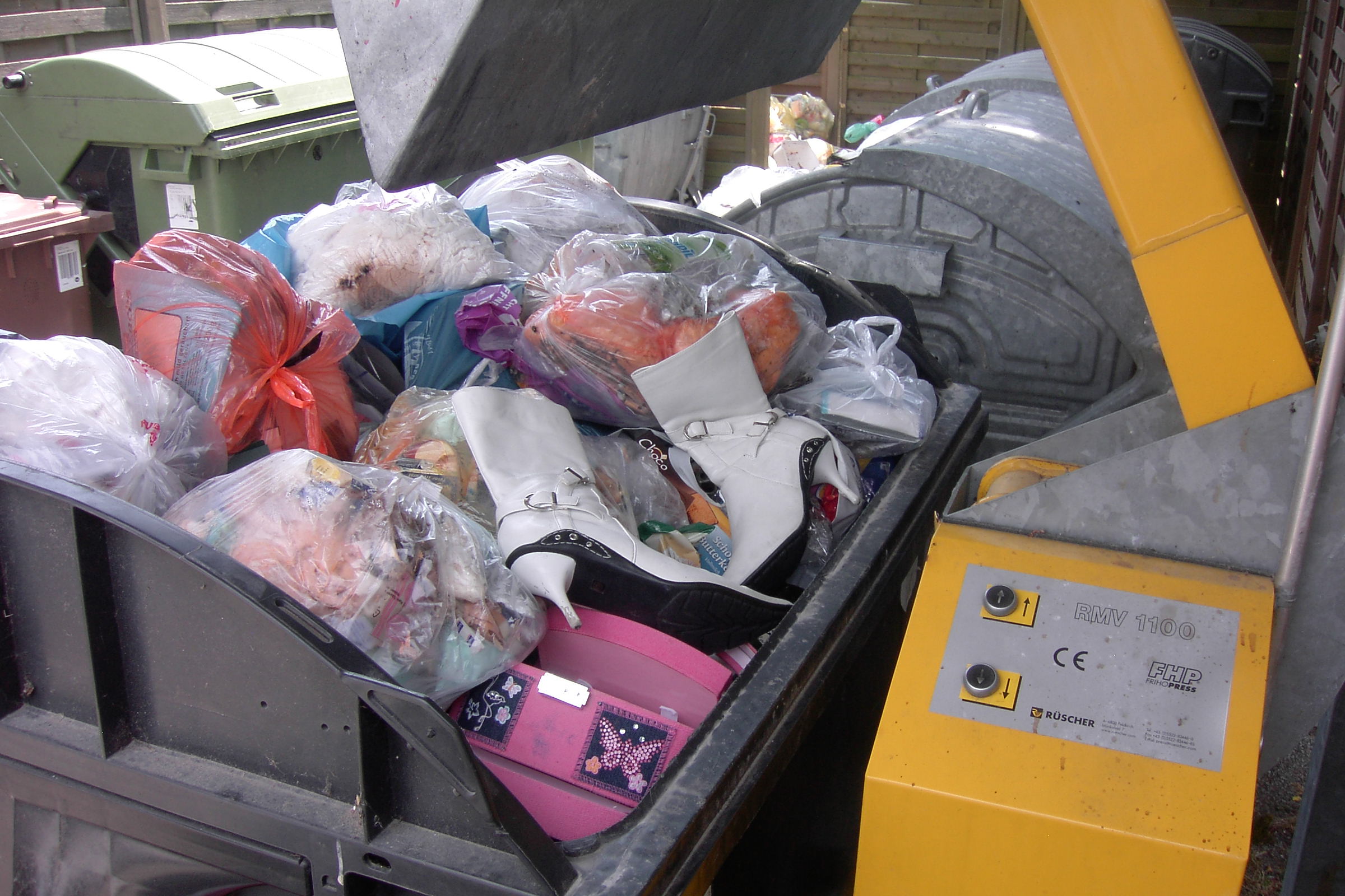 Mülltonnen und -container, Müllschlucker, Sperrmüll, Müllabfuhr, Müllpressen, Müllkippen, Müllverbrennung, Altkleidersammlung und Verschrottung.