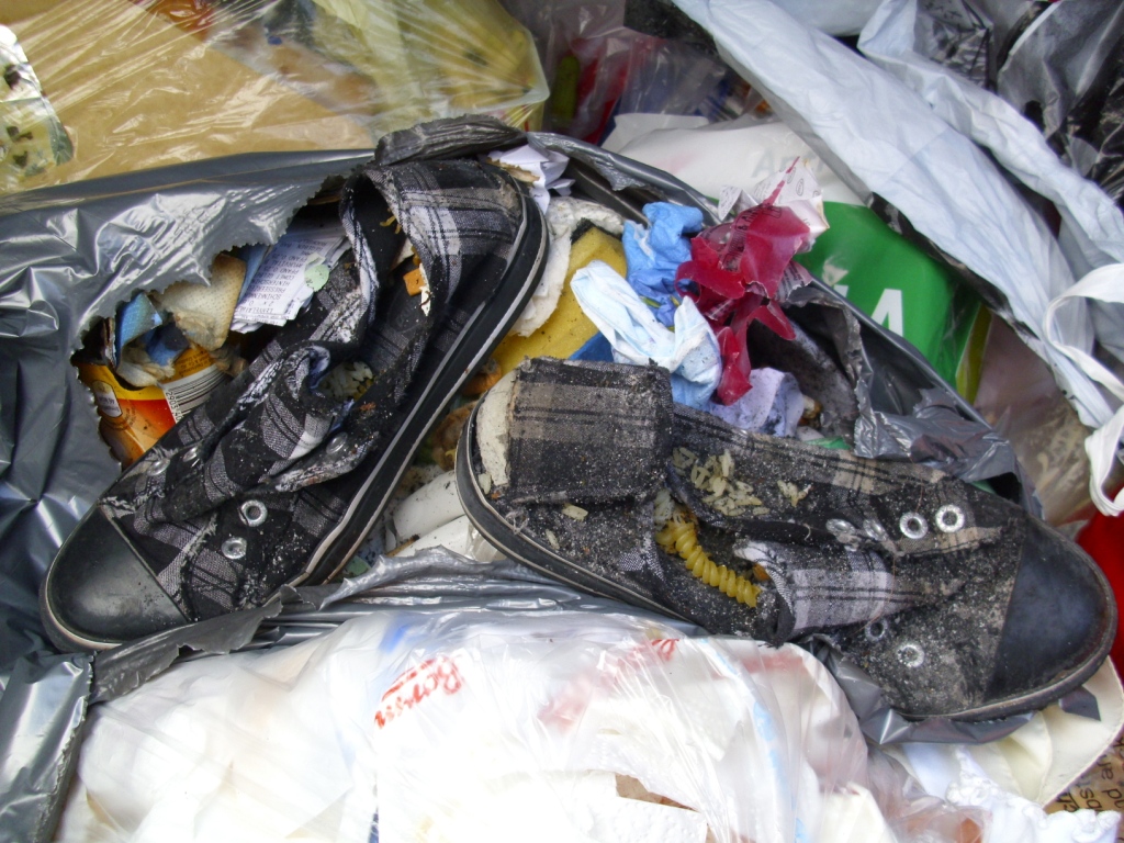 Die peinlich verlatschten Buffalos waren auch nichts mehr für die Altkleidersammlung und lagen ebenfalls zu recht im Restmüll.