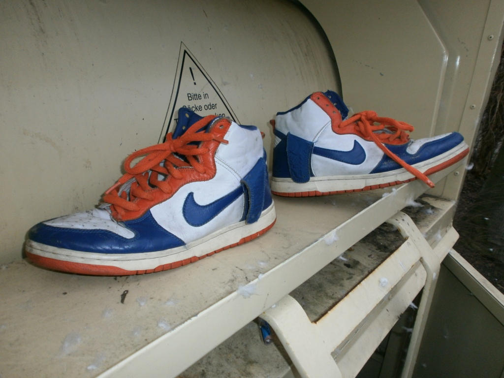 Ich konnte mich nicht beherrschen und habe den Mechanismus der Einwurfklappe betätigt um die alten Nikes einzuwerfen. Doch worein? Grins!
