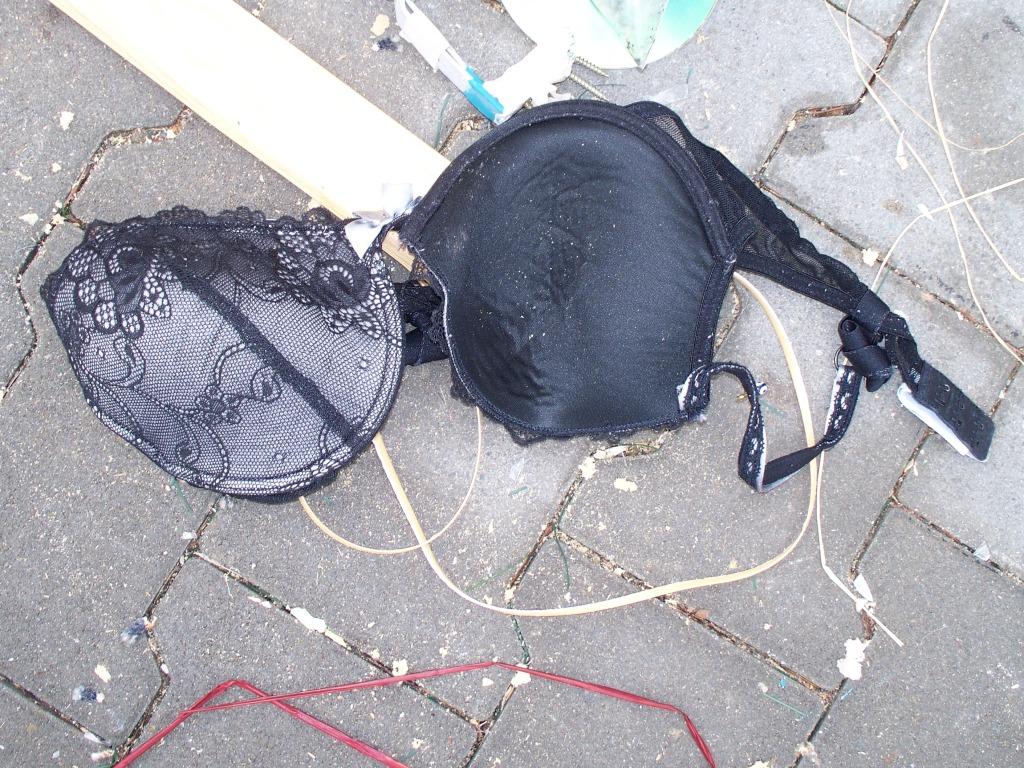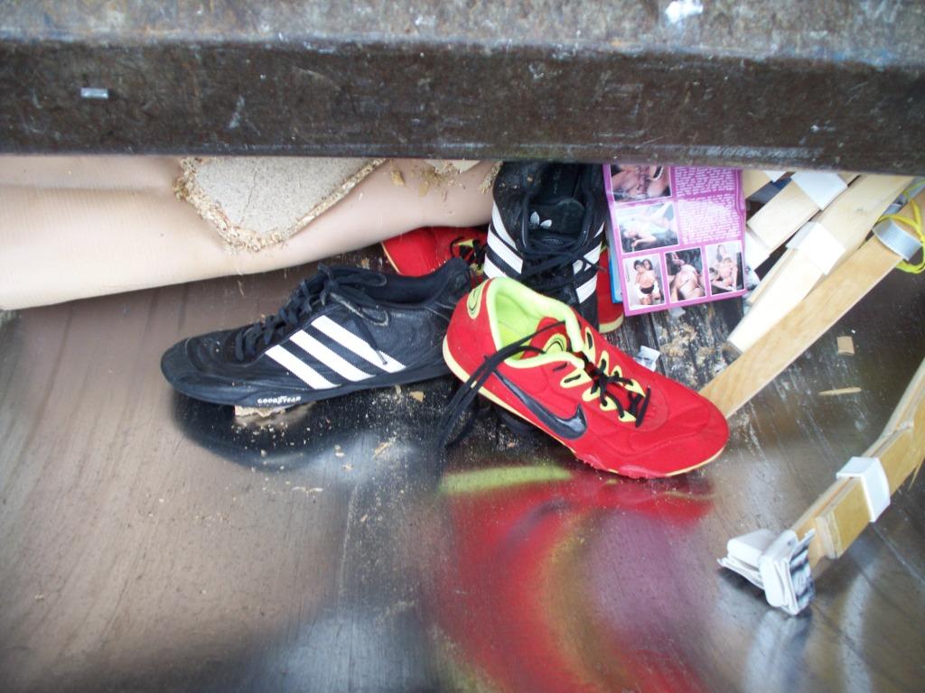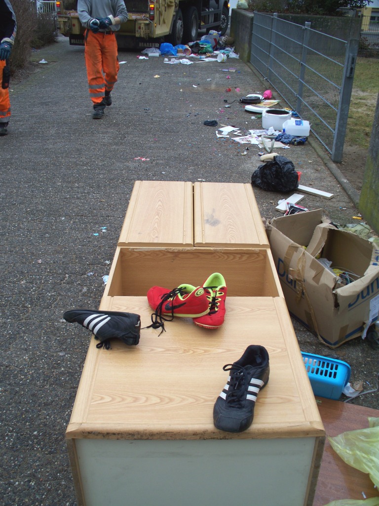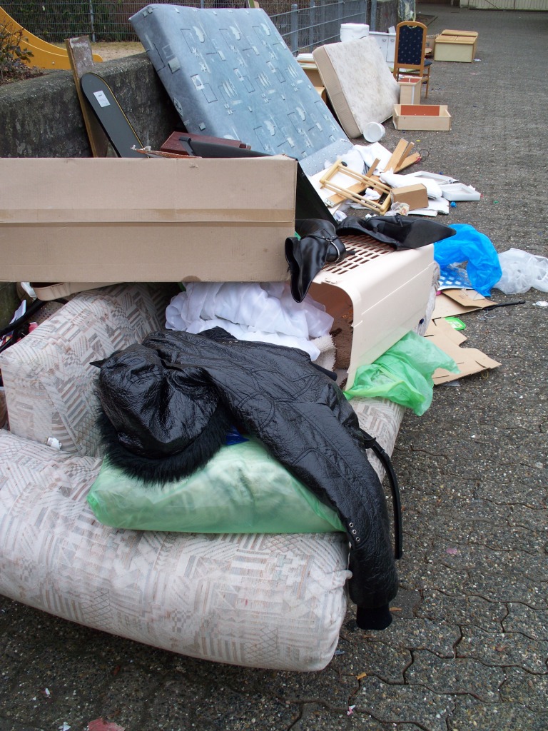 - Die kaputte Jacke und die akten Stiefel gehören eigentlich zwischen anderem kleinteiligem Abfall in den Müllcontainer!
