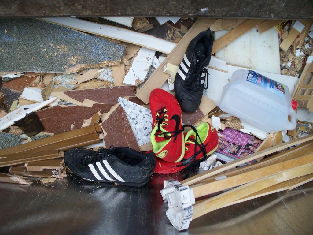 - Dann wurden die Sportschuhe vom übrigen herunter sackenden gepressten Sperrmüll verschüttet.