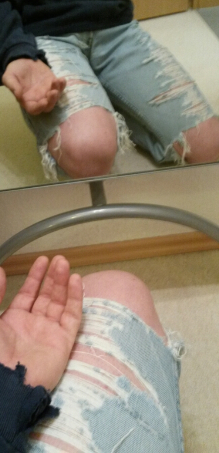 Vor ca. 6 Jahren bin ich in die Hocke gegangen um ein Bett aufzubauen, dabei ist ganz von alleine das erste Loch leicht unterhalb des Knies entstanden.