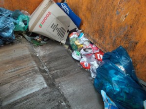 Es war gar nicht lo leicht, die durch den Pressdruck zwischen dem Pressschild und Mülltüten eingeklemmten frisch gepressten Chucks mit viel Kraft dem "Maul" des Pressmüllcontainers zu entreißen.