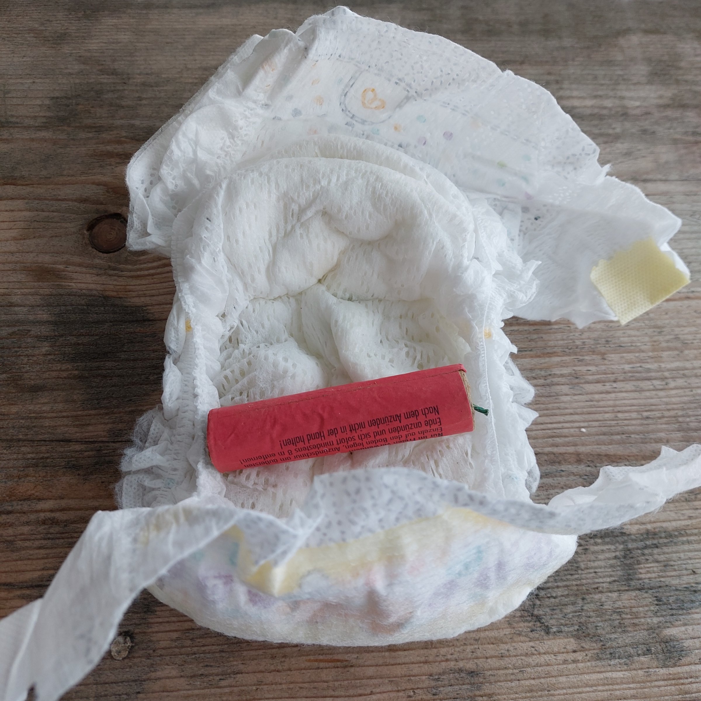 Das mit dem Schnuller in die Windel eindrehen ist zwar möglich, aber dann hätte bei den Mengen an Windeln die ich schon geholt habe in all den Jahren auch mal einer dabei sein müssen