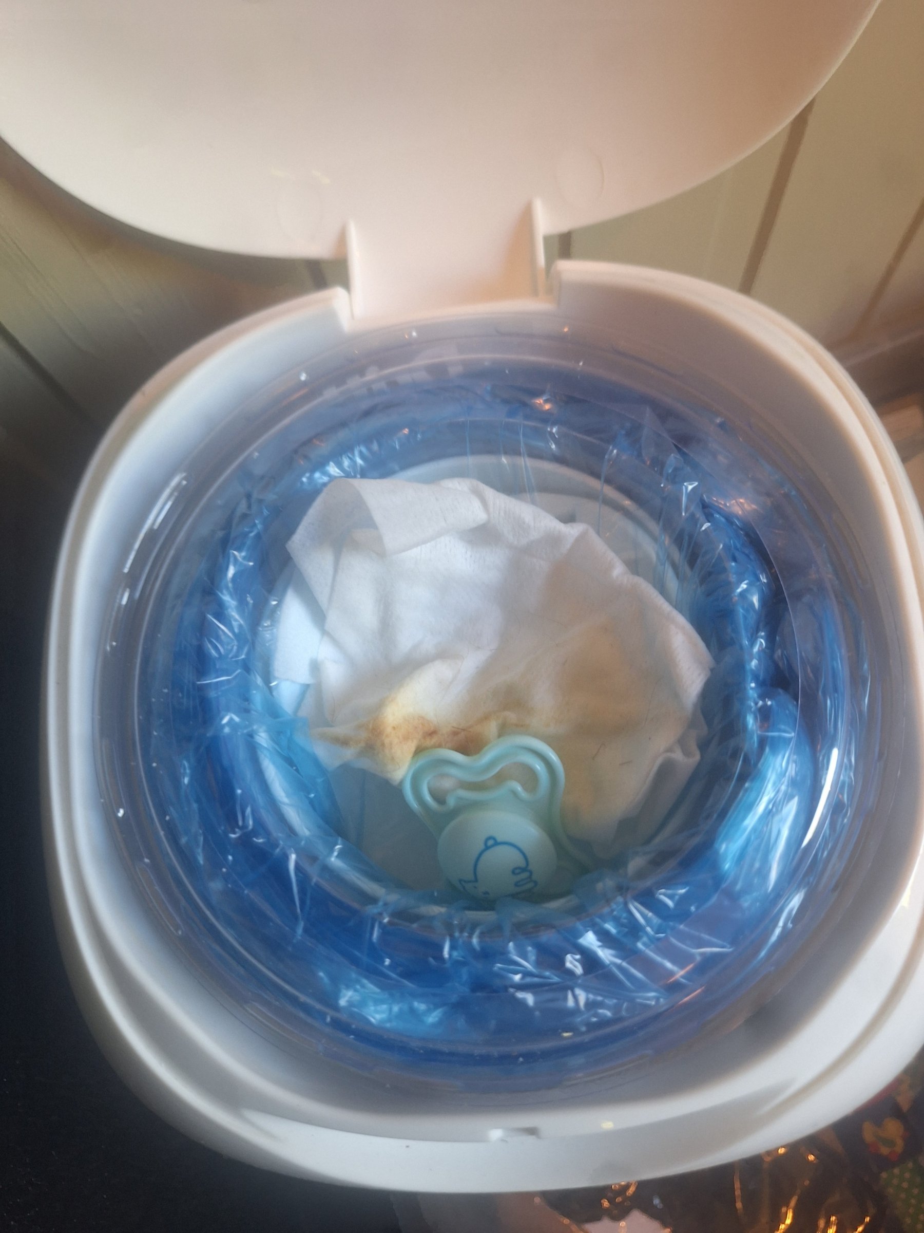 Dieser Schnuller lag einfach oben auf dem Windeleimer und wartete nur darauf, von der nächsten schmutzigen Windel hineingedrückt zu werden