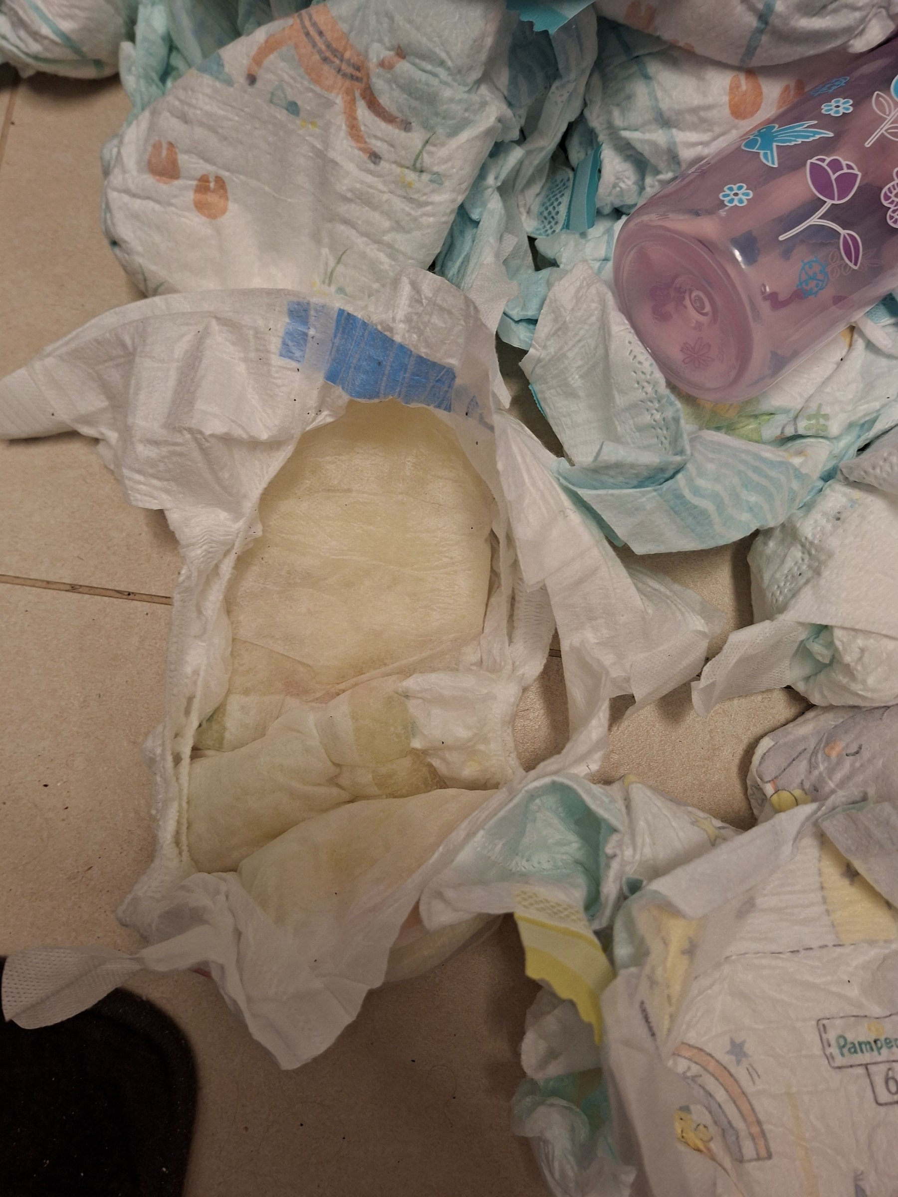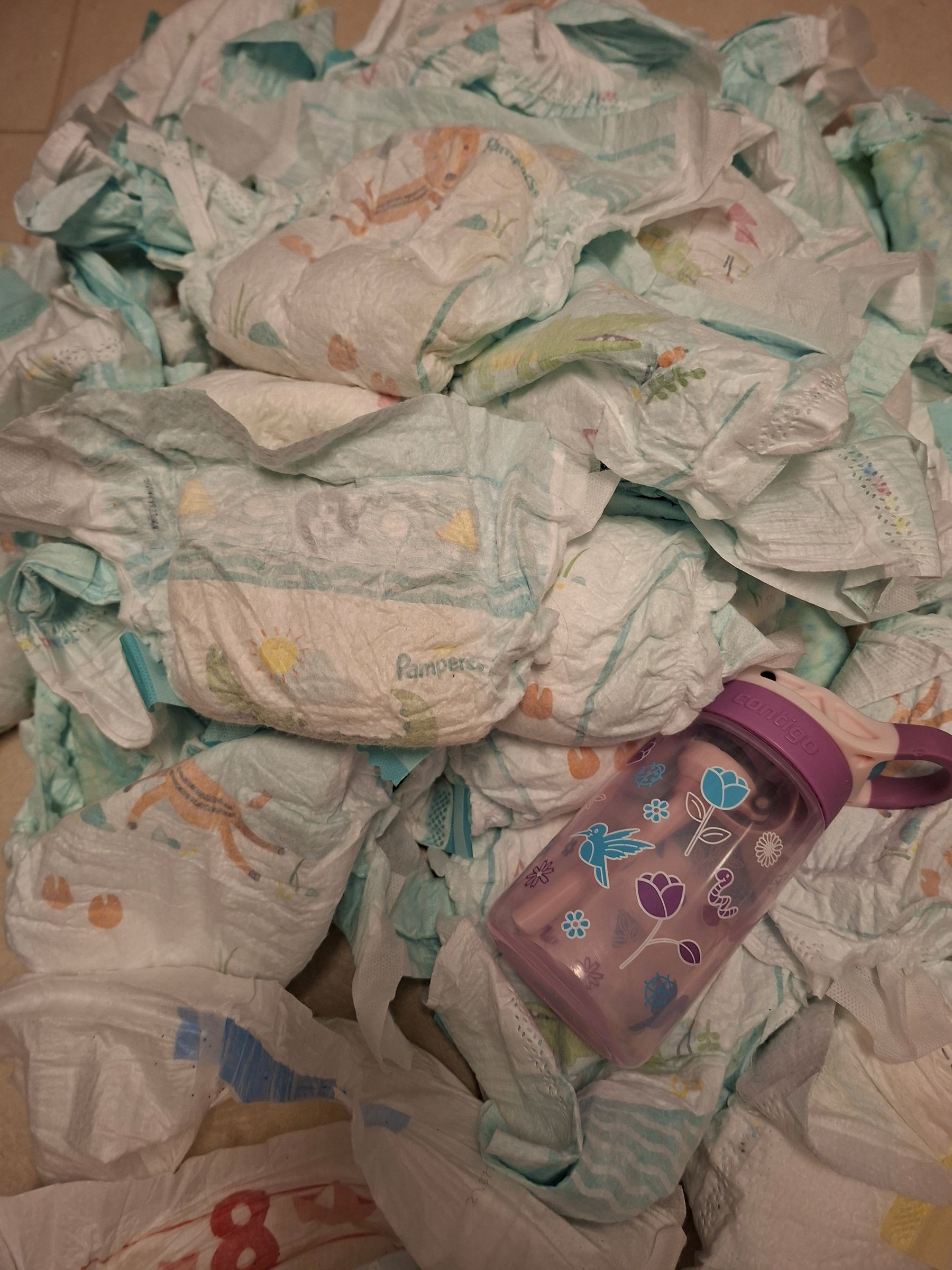 nach längerer Zeit konnte ich endlich mal wieder eine größere Menge wunderschöner Pampers retten: nicht weniger als 29 Stück in Größe 8 hätten planmäßig heute früh Opfer der Müllpresse werden sollen. Die Kacki-Windeln konnte sie gerne haben, die schönen Pipi-Windeln und ein Trinkfläschchen sind nun erstmal in Sicherheit. Dazu kamen noch ein paar Pampers Premium Protection in Gr. 6 und einen triefend nasse Babylove in Gr. 8
