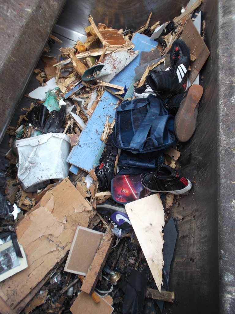 Gleich würden diese Stiefel böse leiden müssen. Glassplitter, viel hartes Holz und eine Presse, die den ganzen Dreck in ein schon fast volles Auto reinpressen muss. Das ist absolut tödlich!