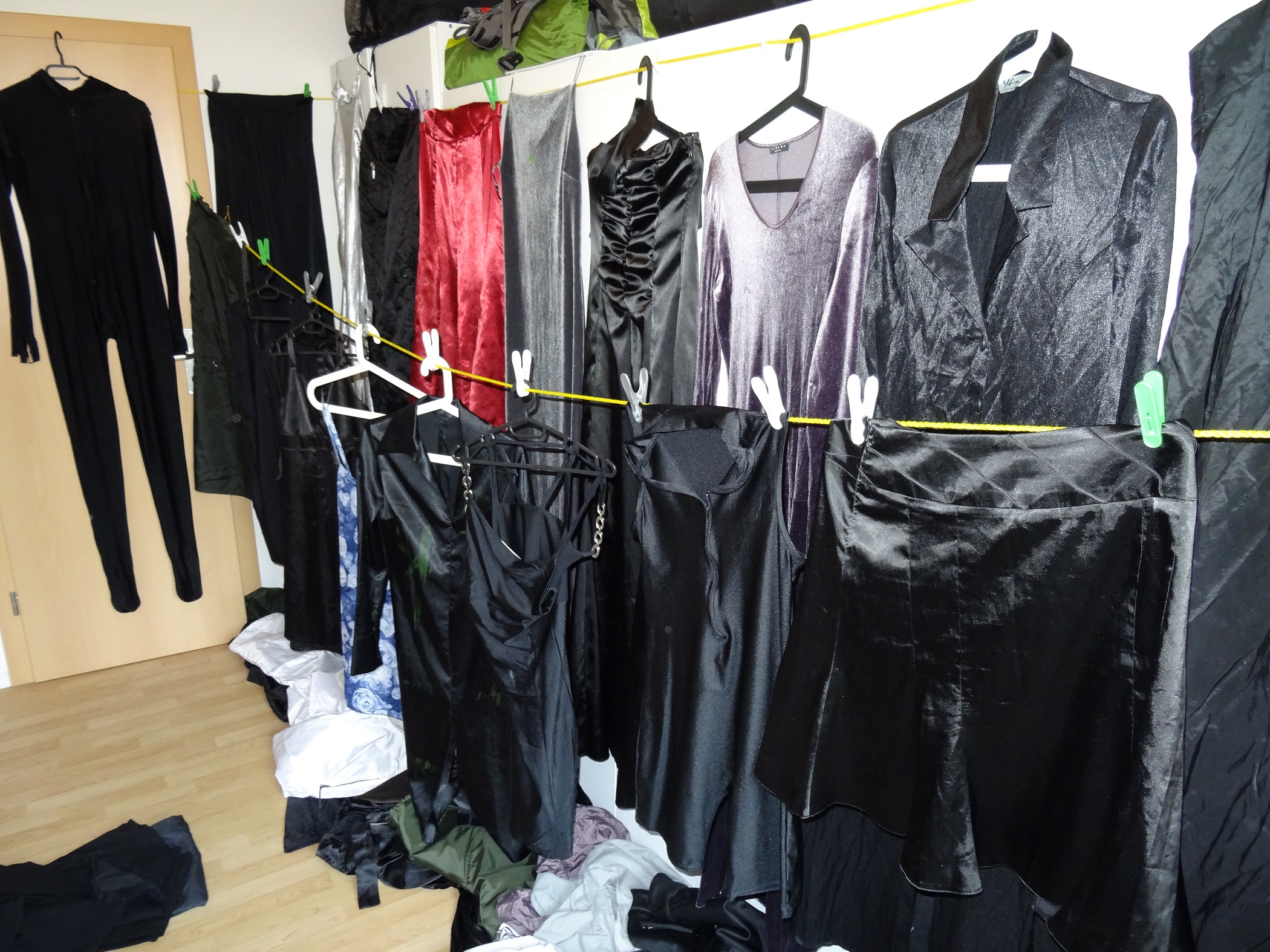 also die dunkelblaue Hose am Samstag verbrennen und das Oberteil mit der grünen Hose vom 3. Bild auf der unteren Leine zerschneiden
