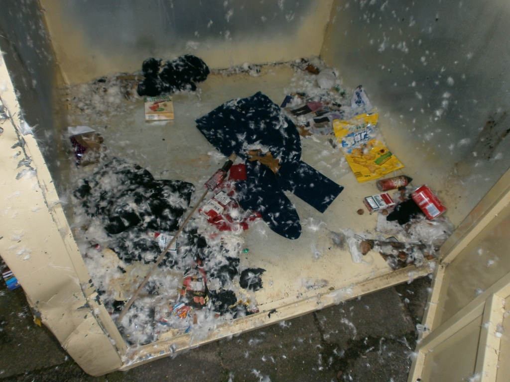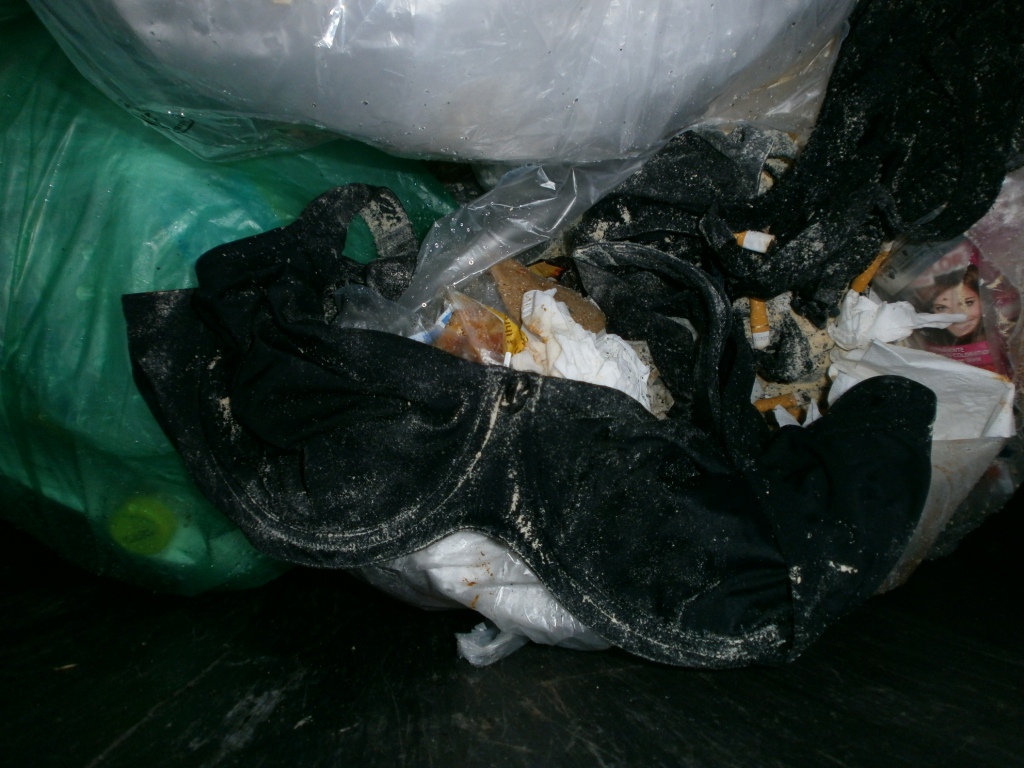 Die ganze abgetragene Wäsche verdreckt und versaut, denn ein paar offene Mülltüten hatten schon ihren Dreck über die Lumpen verteilt.