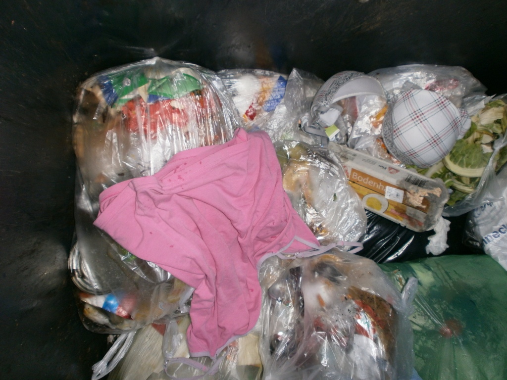 Da hat wohl das Mädel seine ausrangierte Winterjacke mit einem lässigen Wurf in den Müllcontainer geschmissen und (ihren?) Küchenmüllbeutel gleich mit drauf?!