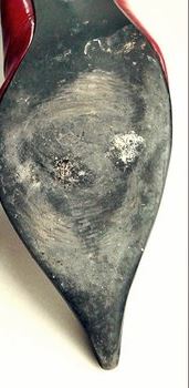 Hier kann man schön die abgestöckelten Absatzflecken sehen. Mittlerweile sind aber Metallabsatzflecken drauf.