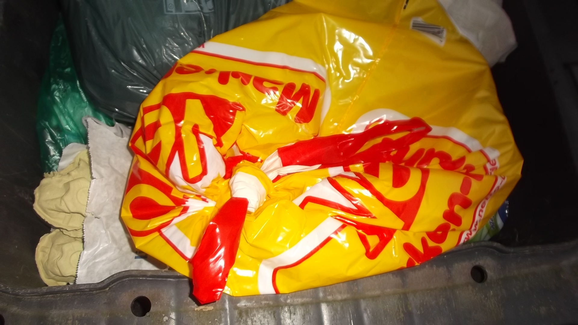 So - das war meine Chance. Ich schnappte mir also auch etwas Abfall und wollte diesen auch entsorgen. Am Abfalleimer angekommen sah ich die zerknüllte Plastik-Leiche liegen. Schnell stopfte ich mir das Plastik in den Hosenbund unter den Pulli und warf meinen Abfall weg.