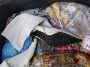 Wenn man also von einer durchschnittlichen 10-Personen-Hausgemeinschaft ausgeht, und außerdem den statistischen Durchschnittswert von 5,5 Paaren Schuhverbrauch annimmt, kann man – rein statistisch betrachtet – pro Woche mit einem Paar Müllschuhen rechnen. Da ich euch aber geschildert habe, dass in unserer Hausgemeinschaft überwiegend Frauen leben und die auch noch zum Teil einen erheblichen Schuhtick haben, können wir diese Zahlen getrost vergessen.