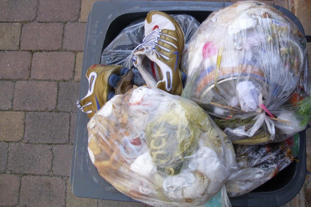 Selbst nur wenige Stunden vor der Müllabfuhr erst in die Tonne geworfen, haben die Turnschuhe noch frischen Hausmüll obenauf bekommen.