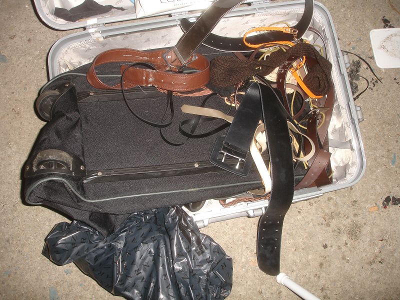 Vor einem Container lag ein Koffer mit unzähligen Gürteln und Krusch