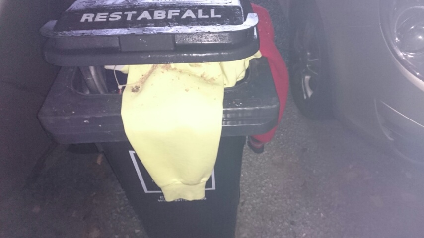 Der Tipp des anderen Mitglieds war, jeweils von dem Pulli wie von der Jacke einen Ärmel über den Tonnenrand rausschauen zu lassen, um vielleicht im letzten Moment vor dem Müllfahrzeug die beiden wieder heraus ziehen zu können, oder falls ich vor Aufregung erstarren sollte, wenigsten die Möglichkeit hätte, noch ein Foto zu machen, wenn sie im Schlund des Fahrzeugs verschwinden.
