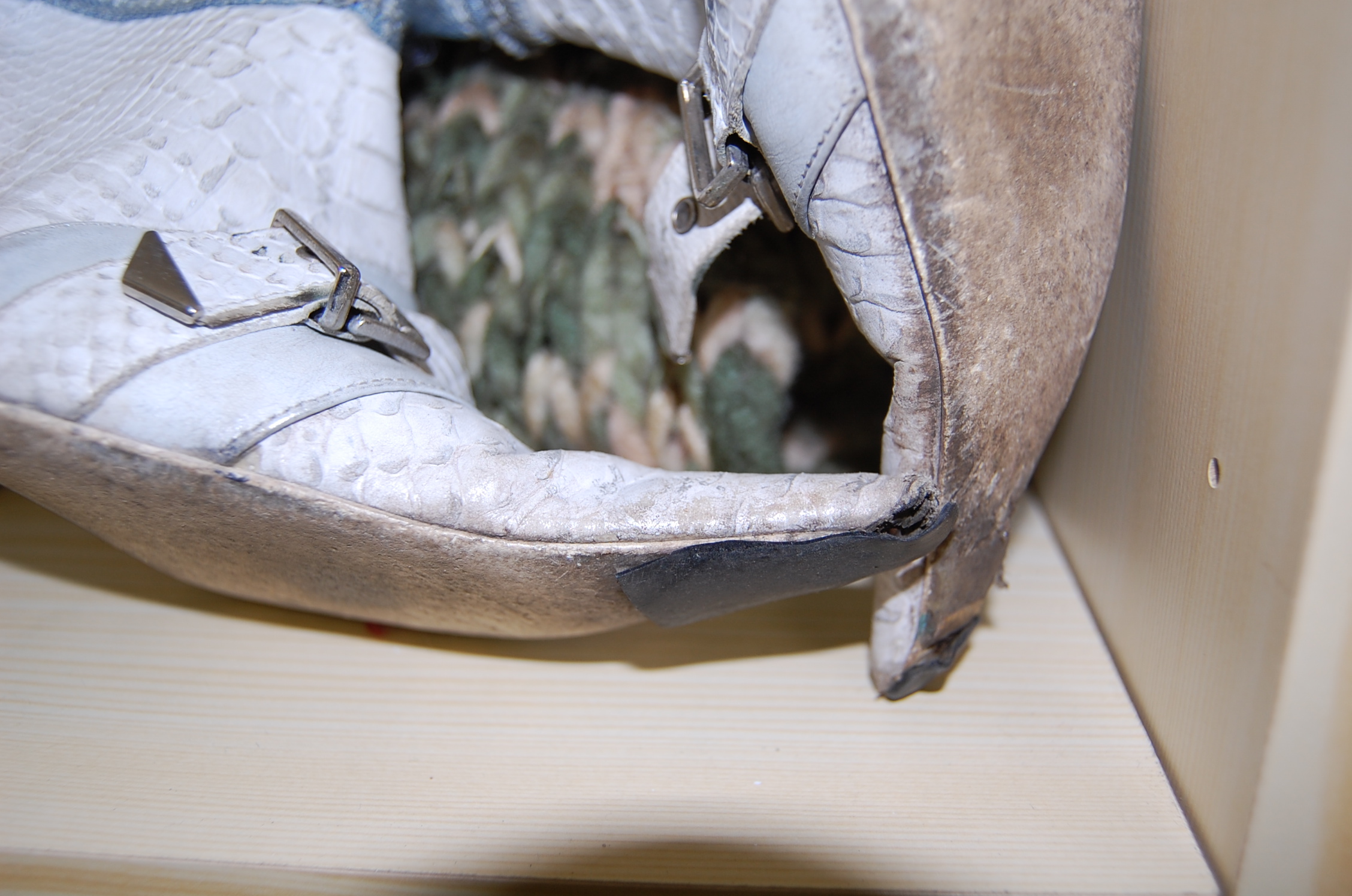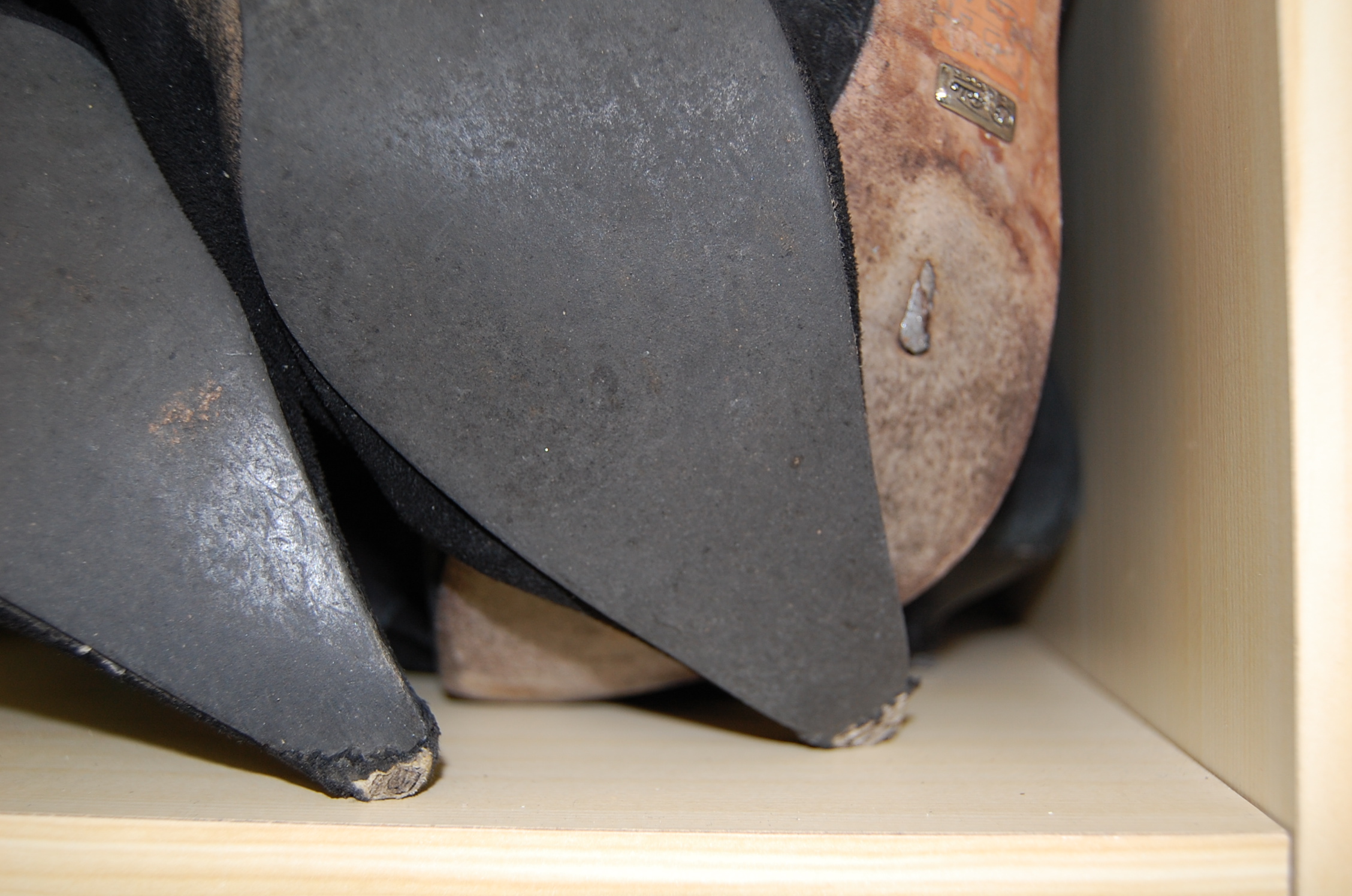 Soweit der Prolog. Der Prolog für ein Paar Designerstiefel der Extraklasse, die man nicht für 100 oder 200 Euro bekommen kann. Dieses Paar wurde von der Erstbesitzerin nur wenige Male getragen. Sie verfügte über mehr als 100 Paare. Und dieses Paar Stiefel wurde zu einem bestimmten Anlass angeschafft und danach nur noch Gelegentlich getragen. Die Abnutzungen an Sohlen und Absätzen bezeugten dies. Schließlich war das geprägte Sohlenprofil nur partiell abgelaufen und die Erstabsätze befanden sich noch in einem sehr akzeptablen Zustand.