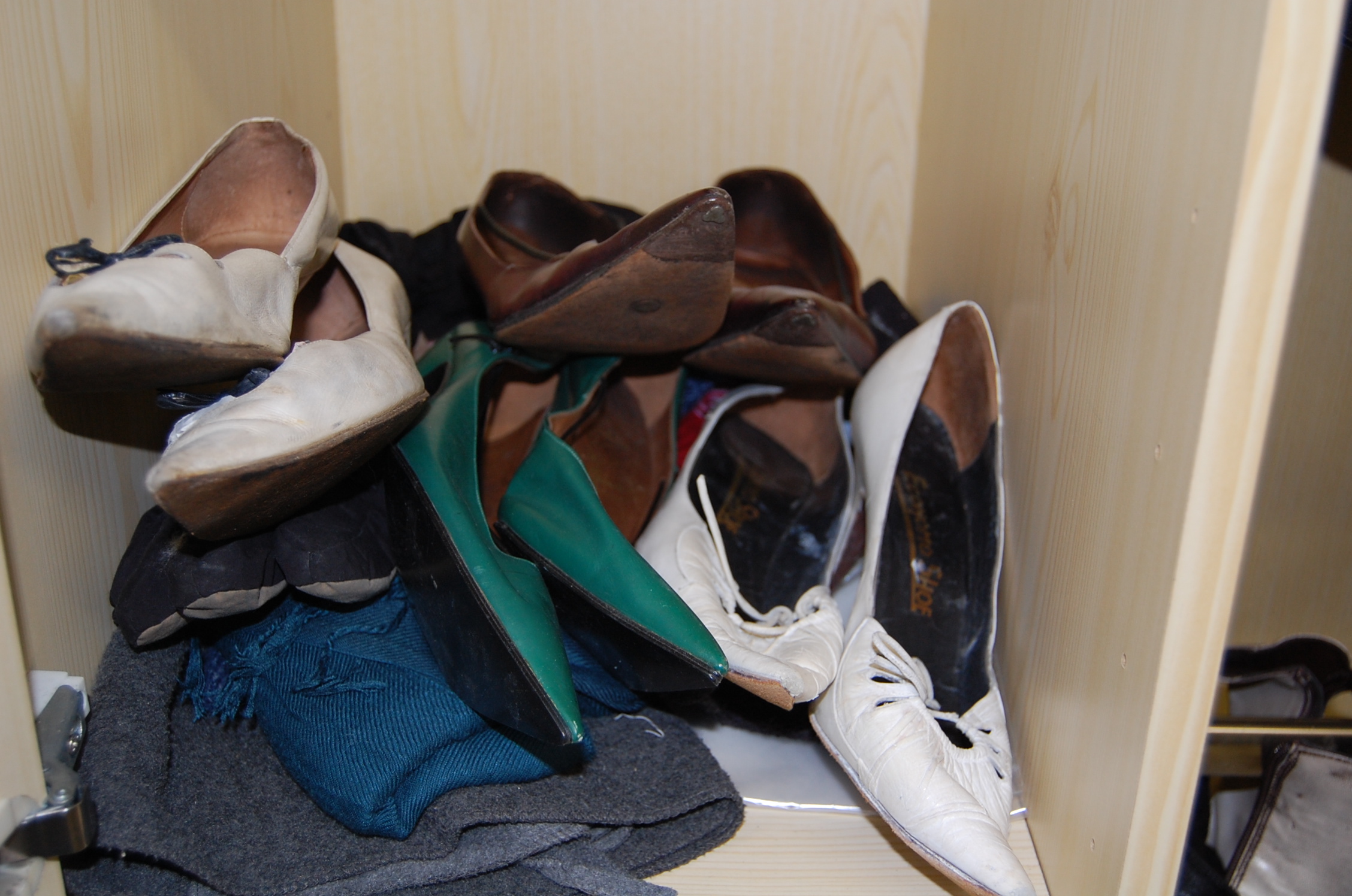 Dieses Fach war ursprünglich für die Aufbewahrung von Wintersachen wie Handschuhen und Mützen gedacht. Da aber wohl die anderen Fächer schon gut gefüllt waren und man sich für den Zugang zu diesem Fach nicht Bücken musste, fand er noch Platz für zwei Paar Wildlederstiefel.