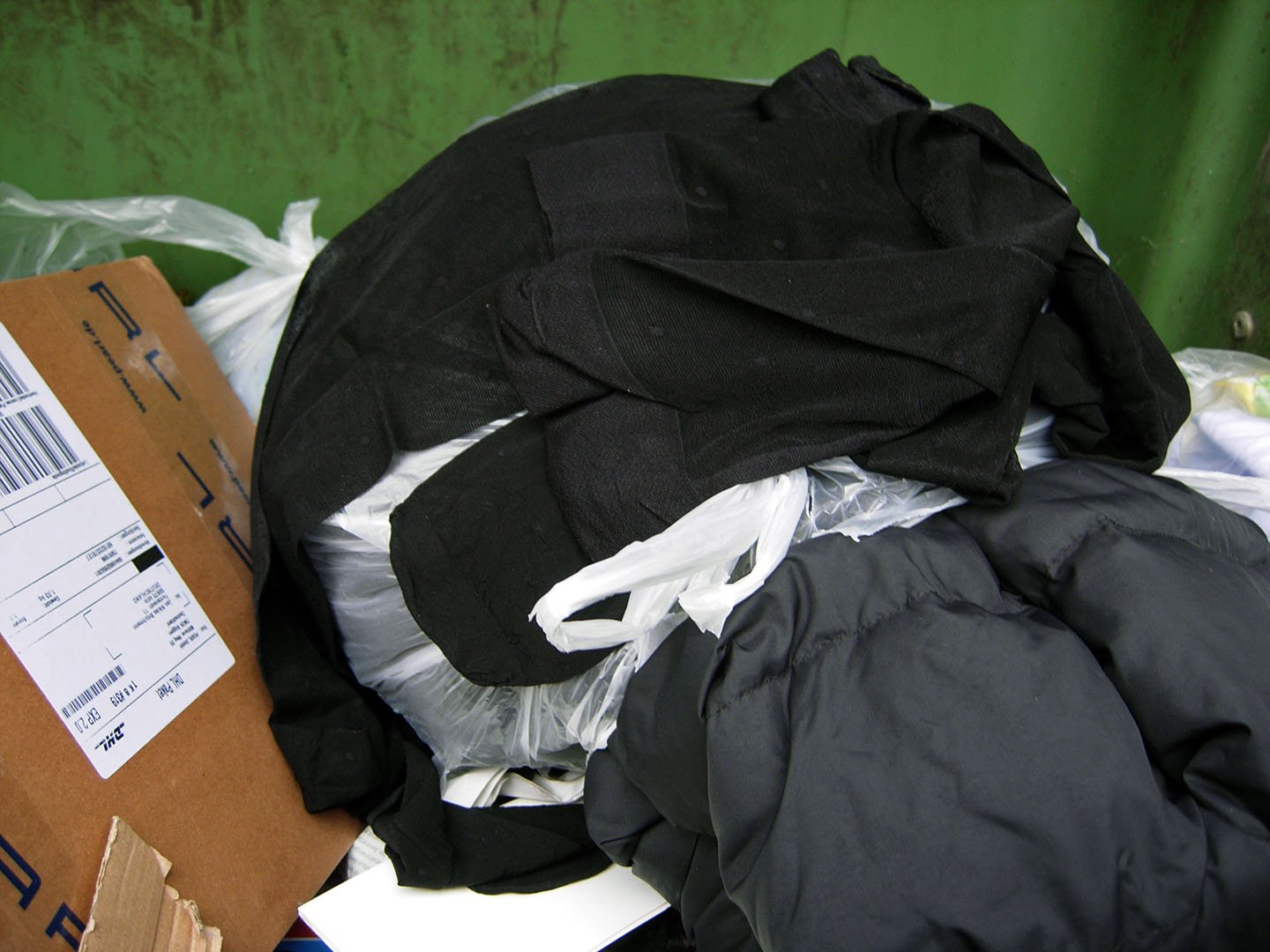 Zwei BH’S, vier Spitzenhöschen, sowie ein Paar Sneaker und diverse Klamotten warten auf die Müllabfuhr. Die BH’S und die Höschen waren völlig intakt und viel zu schade für die Müllverbrennungsanlage. Den Rest hat der Müllwagen verschlungen.