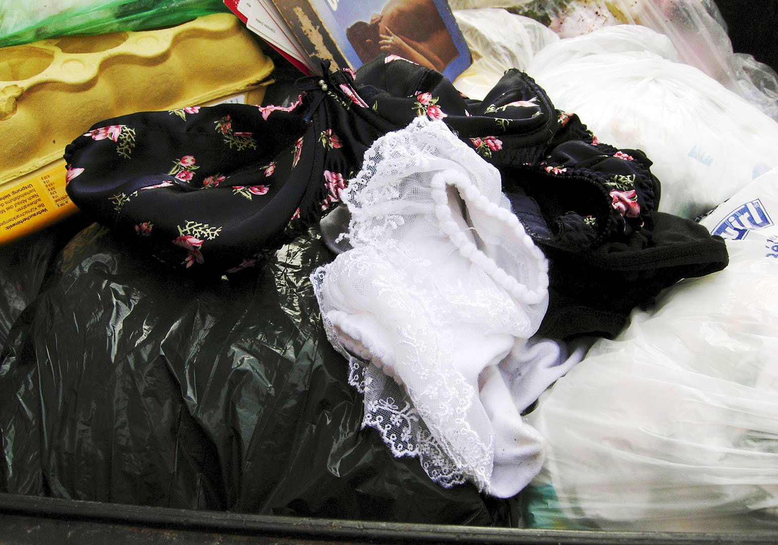 In einem zur Abholung bereit stehenden Müllcontainer warten ein Satin-BH, mehrere Baumwollhöschen und ein Paar Söckchen mit Spitze auf die Müllabfuhr. Alles noch völlig in Ordnung und viel zu schade um es dort liegen zu lassen.