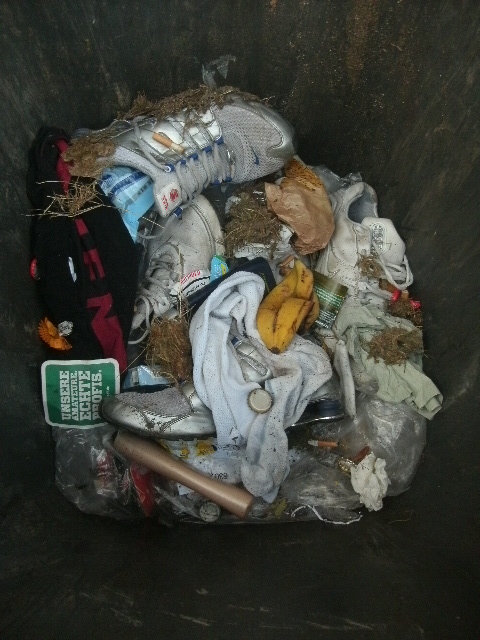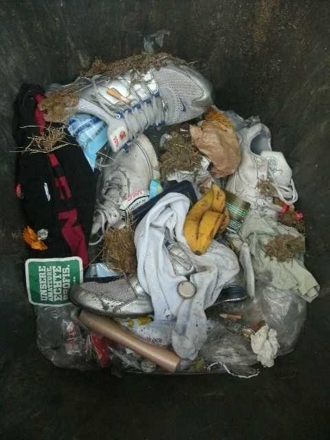 - Alte, ausrangierte Sportschuhe, dreckige Strümpfe, ne verschwitzte Unterhose, Hygienetücher, Kronkorken von Erfrischungsgetränken, Bananenschalen und Duschgelflaschen, Kehricht und - zu meinem großen Erstaunen - vielzuviele Zigarettenkippen!!!