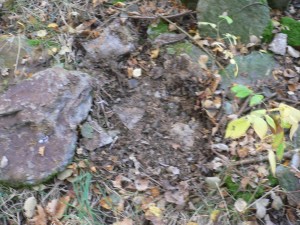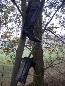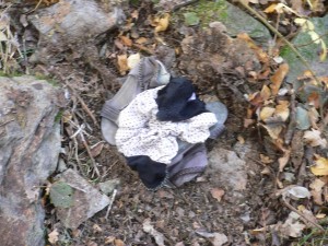 Das erste Teil ist die graue Sporthose aus Kunstgewebe. Die hat meinen Lieblingsplatz im Schlammbecken an der Straße gefunden. Dort hat sich schon einiges von mir aufgelöst, weil der Schlamm wahrscheinlich etwas "agressiv" ist. Ein paar Meter weiter befindet sich gleich das kleine Waldstück, wo ich gerne mal was auslege.