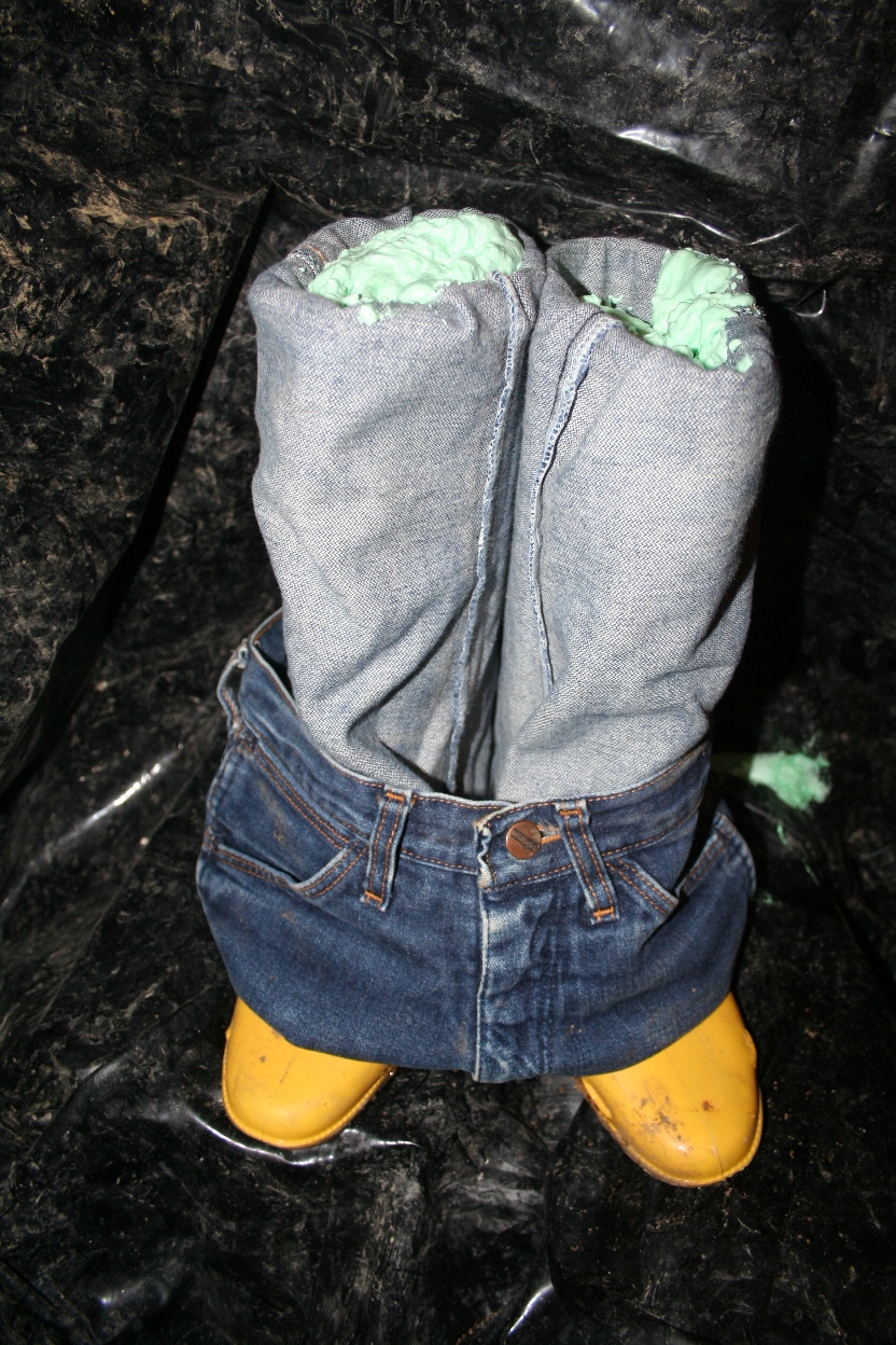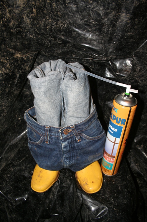 Morgens waren die Gummistiefel prall gefüllt und fest. Sie fädelten einen dicken Draht mehrfach durch die Gürtelschlaufen und formten dann den Hosenbund so, das es halbwegs natürlich aussah. Das ganze wurde an mehreren Stellen aufgehangen und die Jeans bekamen ihre Bauschaum Füllung. Erneut war trocknen angesagt.