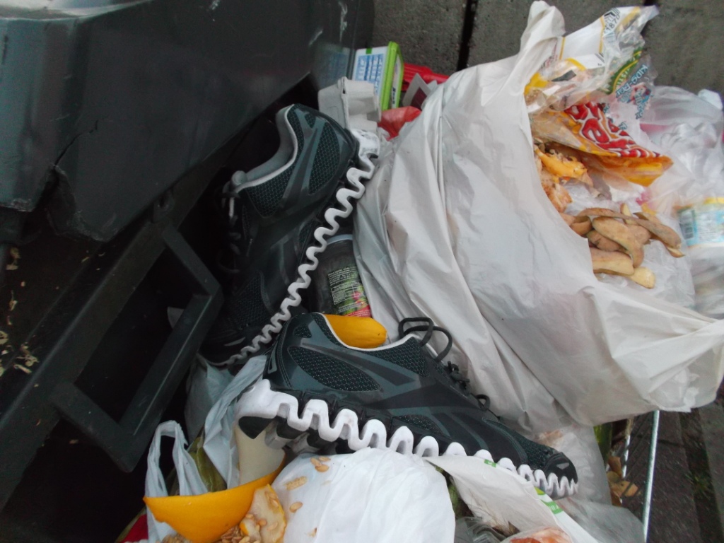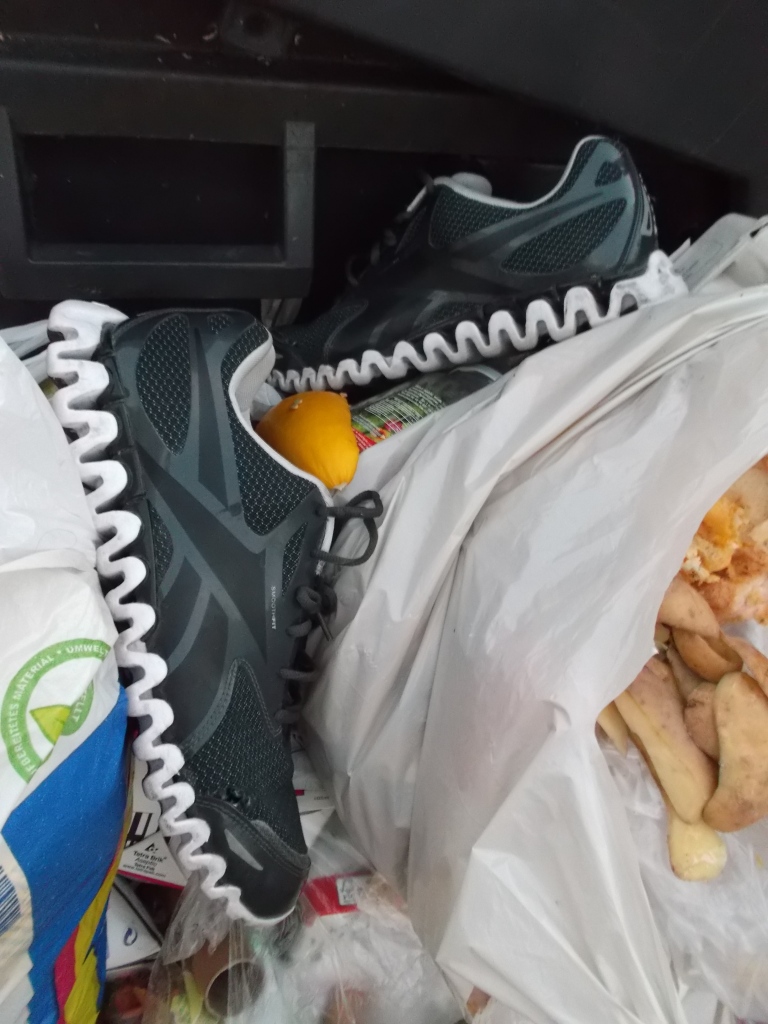 In einem Müllcontainer auf der gleichen Tour gefunden: Ein Mädel hat ihre alten Schuhe runter zum Müllcontainer gebracht und sie einzeln nach eingehender Prüfung erst weggeschmissen: