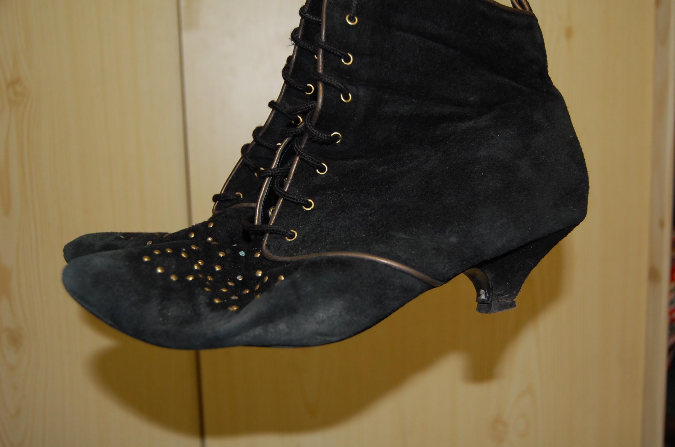 das nächste Paar wurde auch sehr gerne getragen. Aber nach meiner Erinnerung war diese Paar nicht so bequem, wie das zuvor vorgestellte Paar. Es hat goldene Abschlussnähte und lauter kleine Metallzierpünktchen, von denen ich durch den Gebrauch schon den einen anderen verloren habe. Auch hier wurden die ursprünglichen Pfennigabsätze später auf ein größeres Münzformat gebracht.
