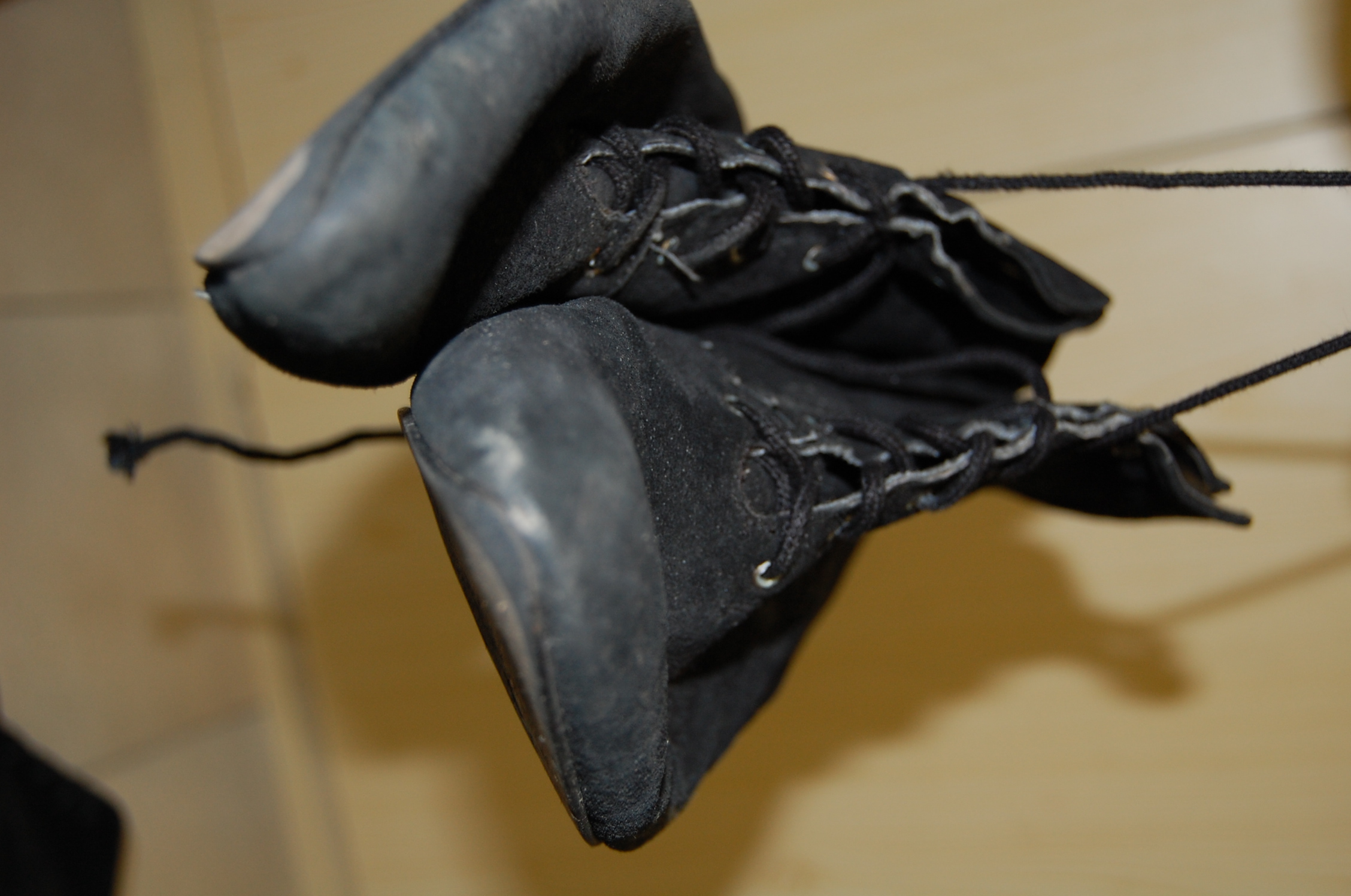 Die Sohlen sind noch heile, aber stellenweise hauchdünn. Dafür sind die Spitzen sehr abgestoßen.