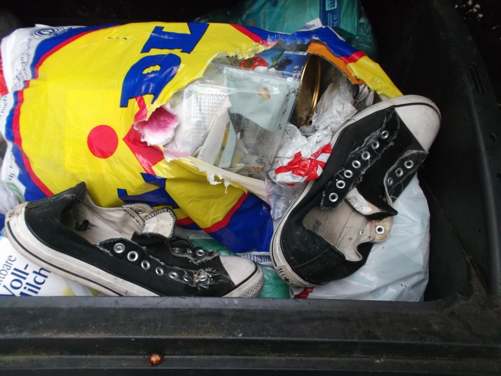 ein Paar Chucks hat ein Riesenglück gehabt: Erstens: Ich war genau in diesem Viertel auf Mülltour. Zweitens: Auf die Chucks kam nicht gleich Tomatensoße hinterher in die Mülltüte. Drittens: Die Mülltüte war so prall gefüllt, dass die Sohlen sich durch die blickdichte Plastiktäte abzeichneten und die Tüte so mit Schwung in den Müllcontainer geschmissen worden war, dass die unten im Küchenmüll liegenden Chucks doch in meinem Blickfeld lagen.