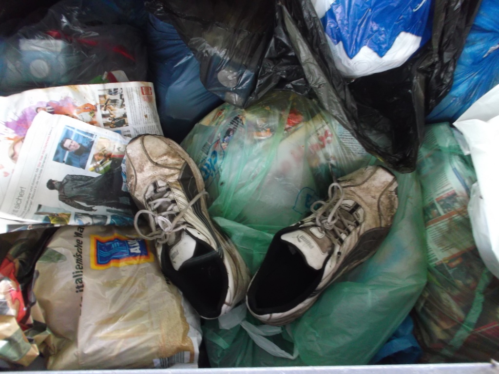 ich konnte beobachten, wie ein junges Mädel seine Abfälle zu einem Großmüllcontainer brachte. Es war interessant zu beobachten. Etwas zaghaft und scheu stellte sie ihre alten Schuhe immer paarweise auf die Schräge der Innenwandung und ließ ihre alten Lieblinge in den Dreck rutschen. Das konnte ich nur als "lieb" bezeichnen.