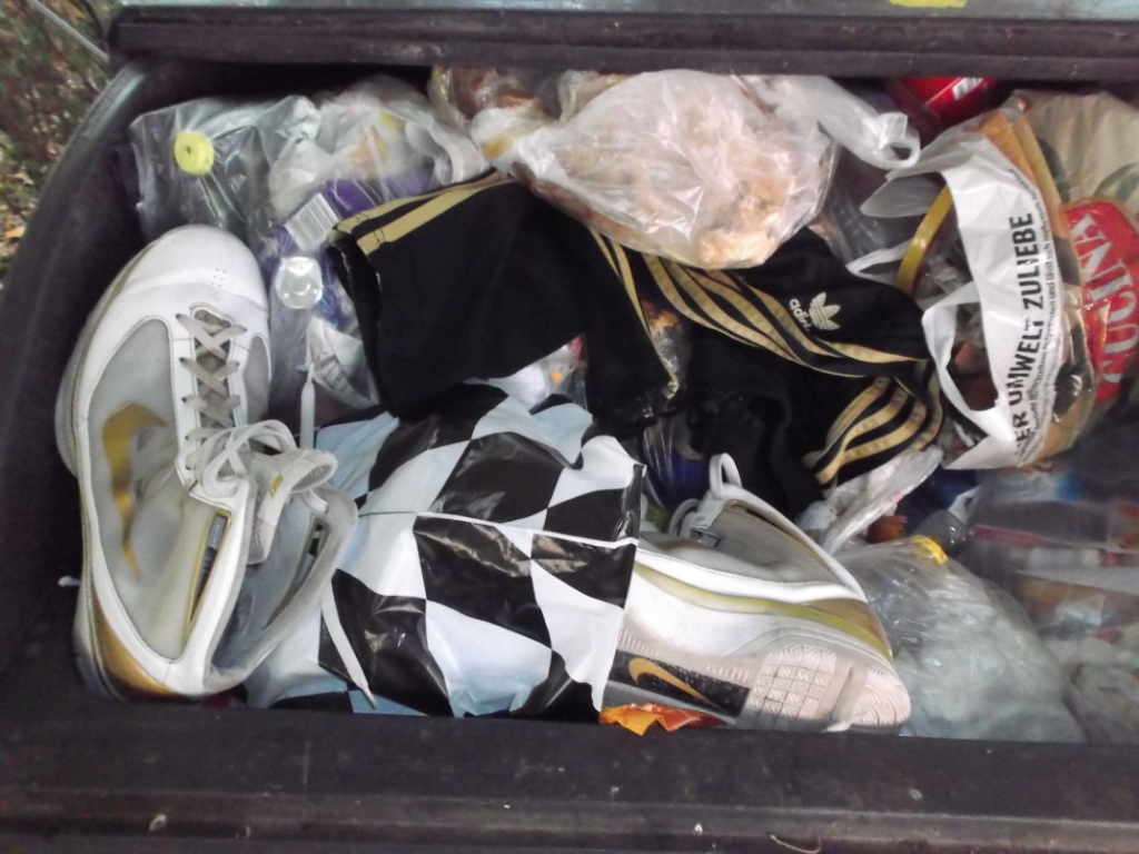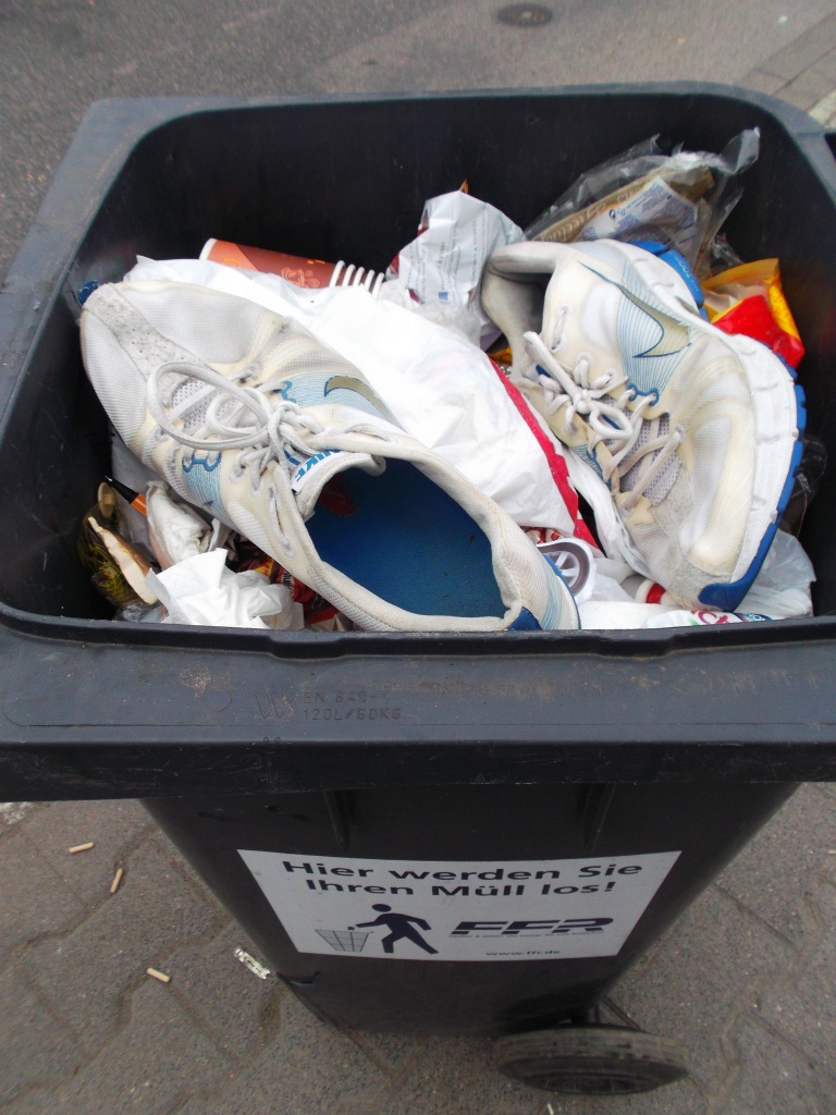 Endfertige Sneakers im Restmüllcontainer
