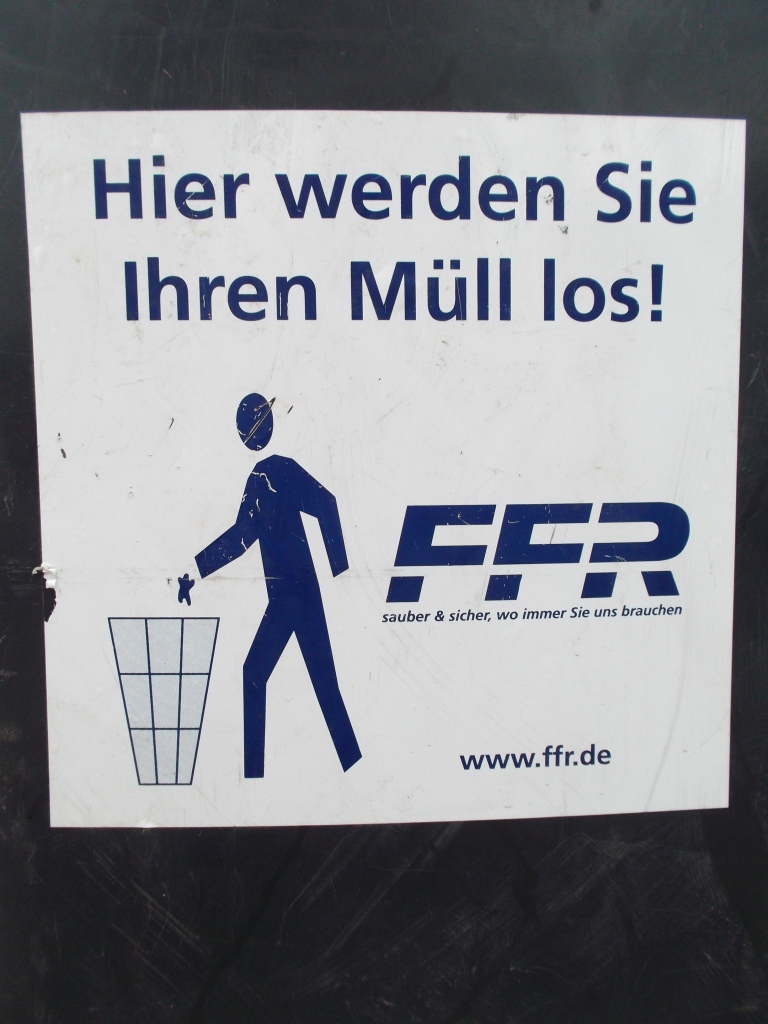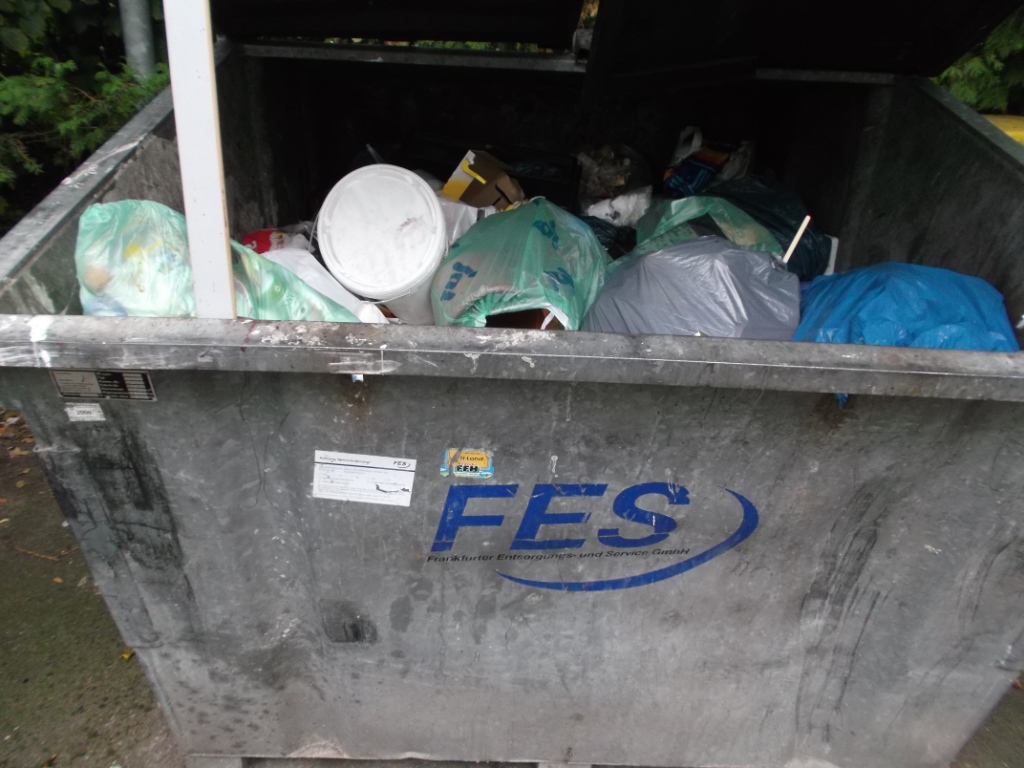 am gleichen Tag in Frankfurt am Main, aber an einer anderen Ecke der Stadt ("Dribbdebach"), (ich kam gerade von "Hibbdebach"), standen in einem Wohnviertel kleine 120-L-Mülltonnen zur Leerung bereit. Aus weiter Entfernung sah ich eine Frau noch schnell einiges in ihre Mülltonne stopfen, bevor die Müllabfuhr kommt. Das weckte völlig zu recht mein Interesse: