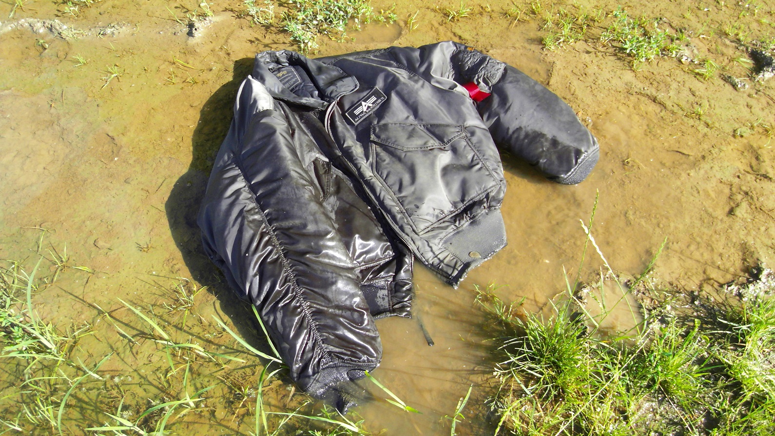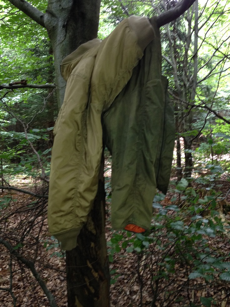 Rote Bomberjacke nach 3 Jahren im Wald zurückgeholt. Leider von MÄusen zerfressen und schwer von der Sonne ausgebleicht aber noch alles dran