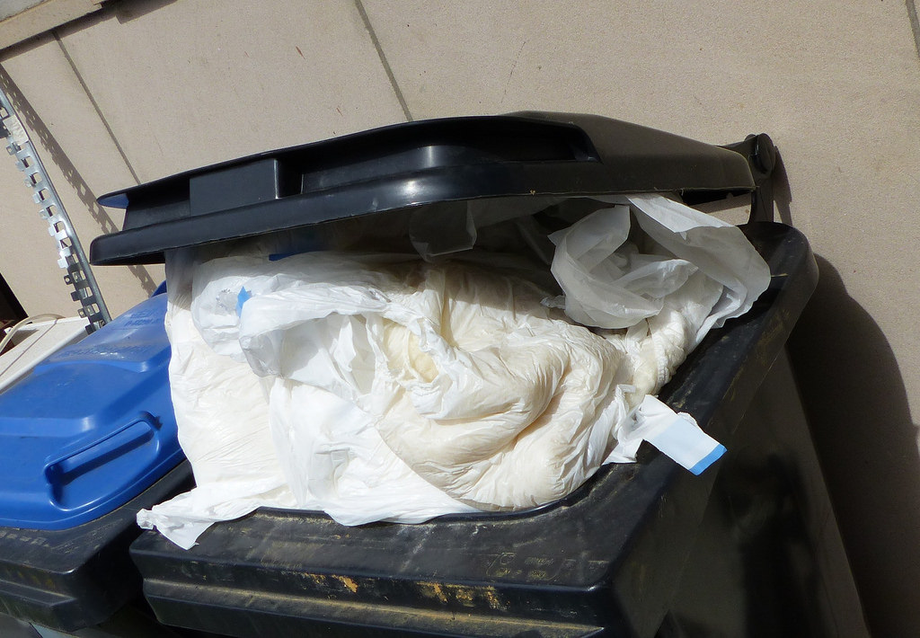 Diese Tonne war gestern Abend noch bis zum Überlaufen gefüllt - heute morgen sind die vielen Babylove-Windeln dann einzeln in die Müllpresse gepurzelt und sahen wenige Sekunden später sicher nicht mehr so schön sauber und weiß aus.