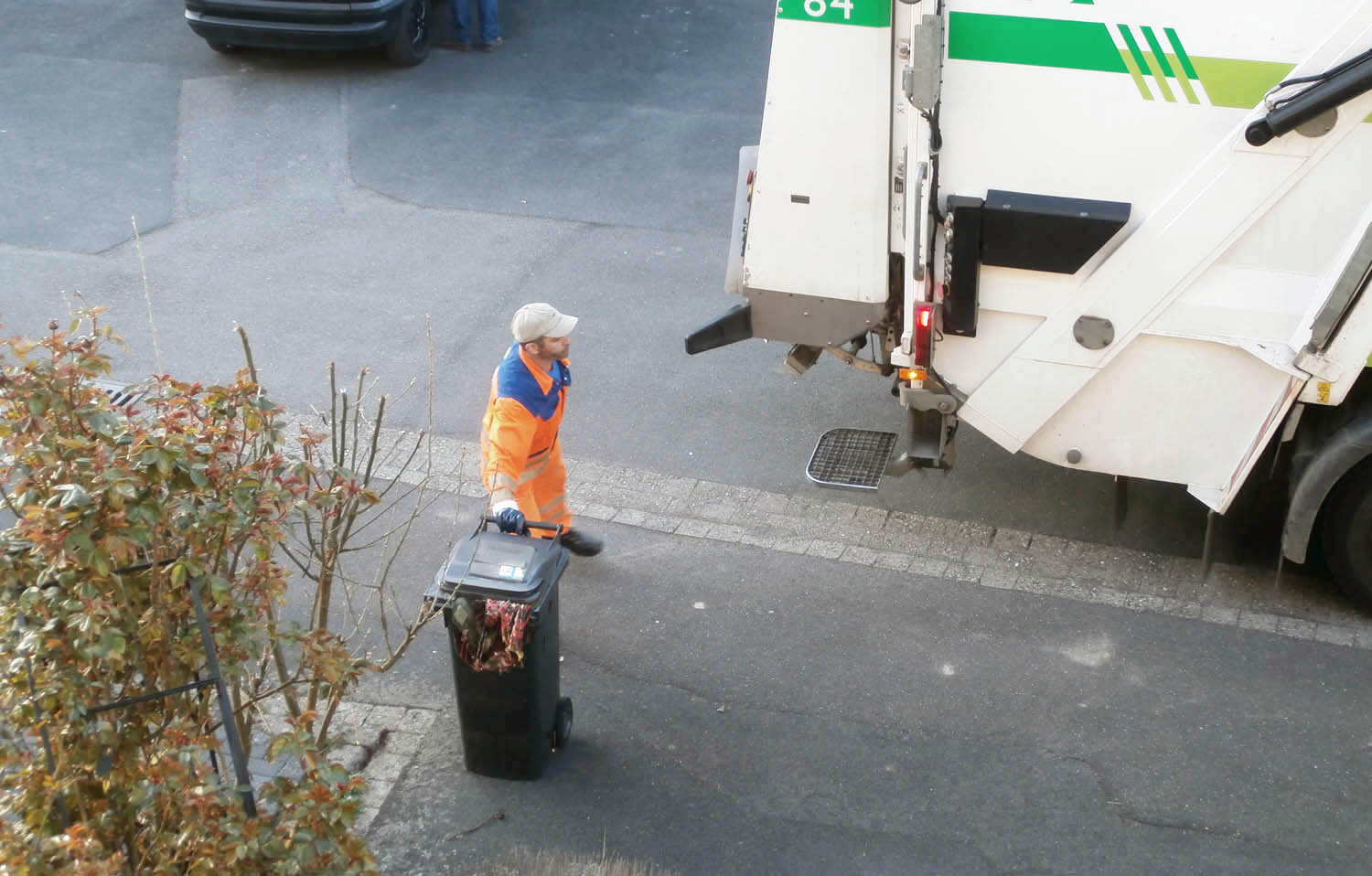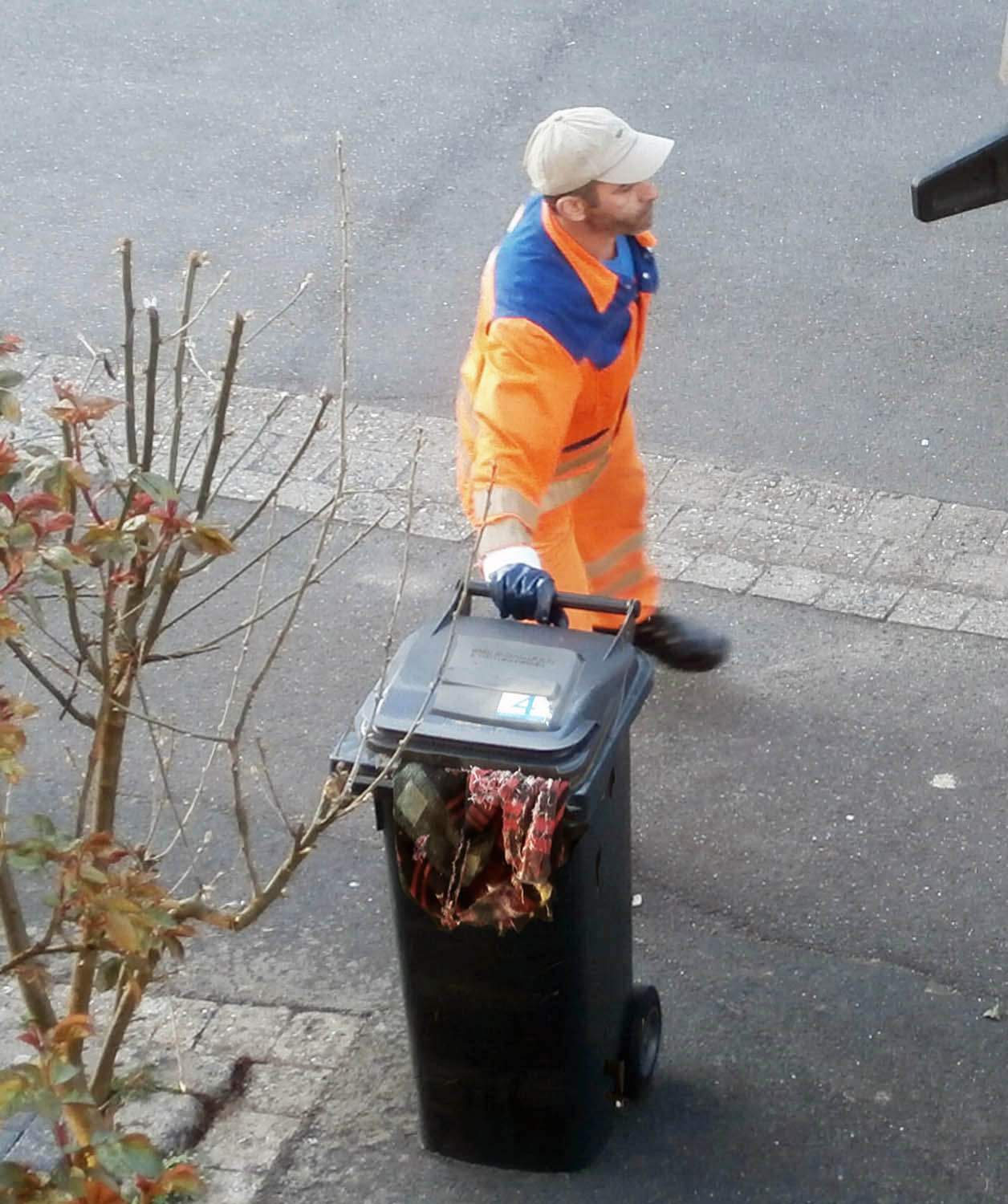 Müllwerker holt die Tonne. Die heraushängende Decke interessiert ihn nicht