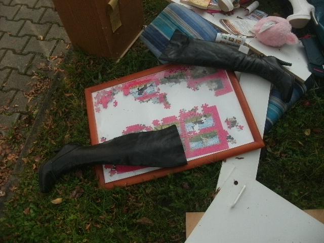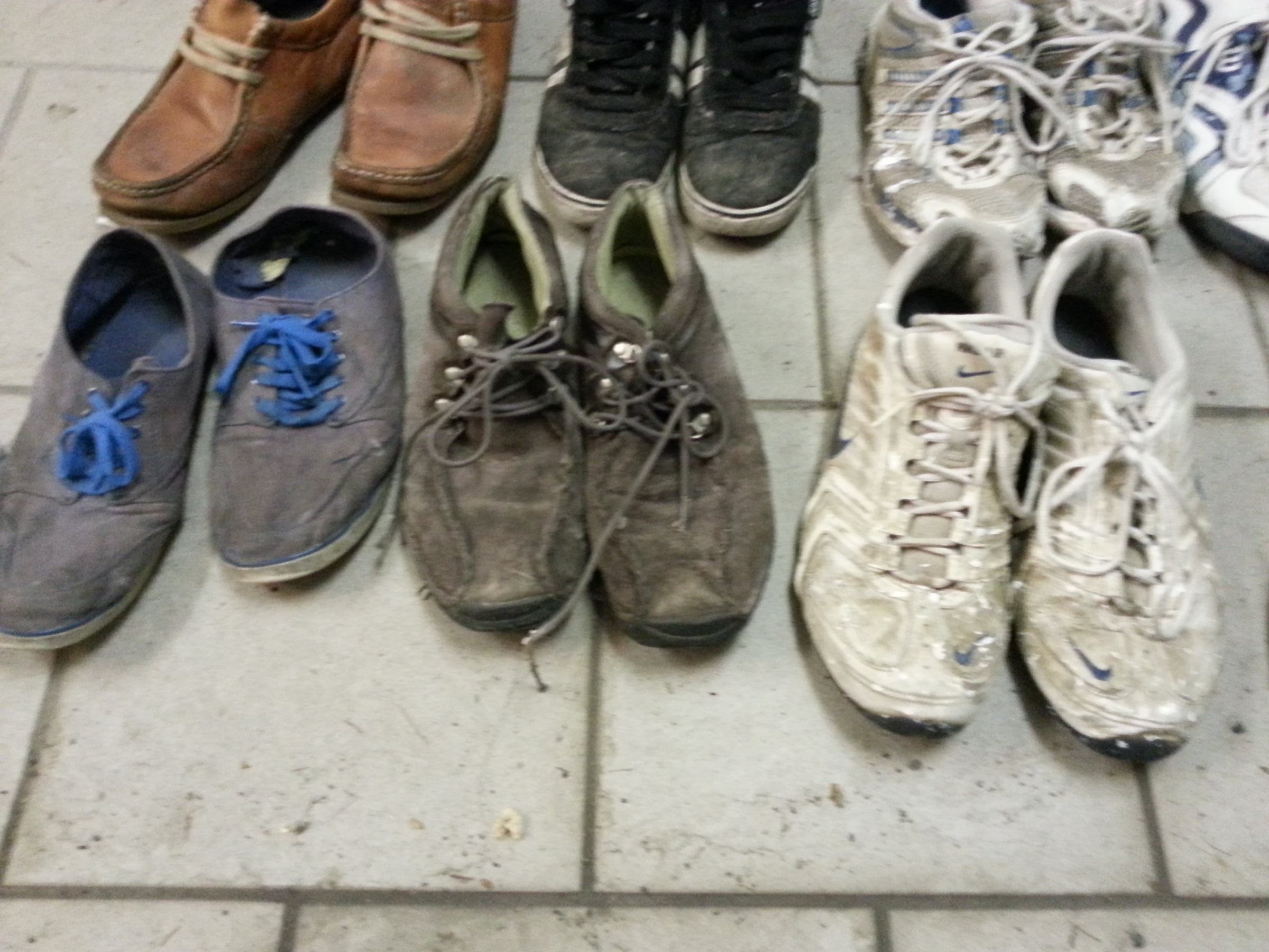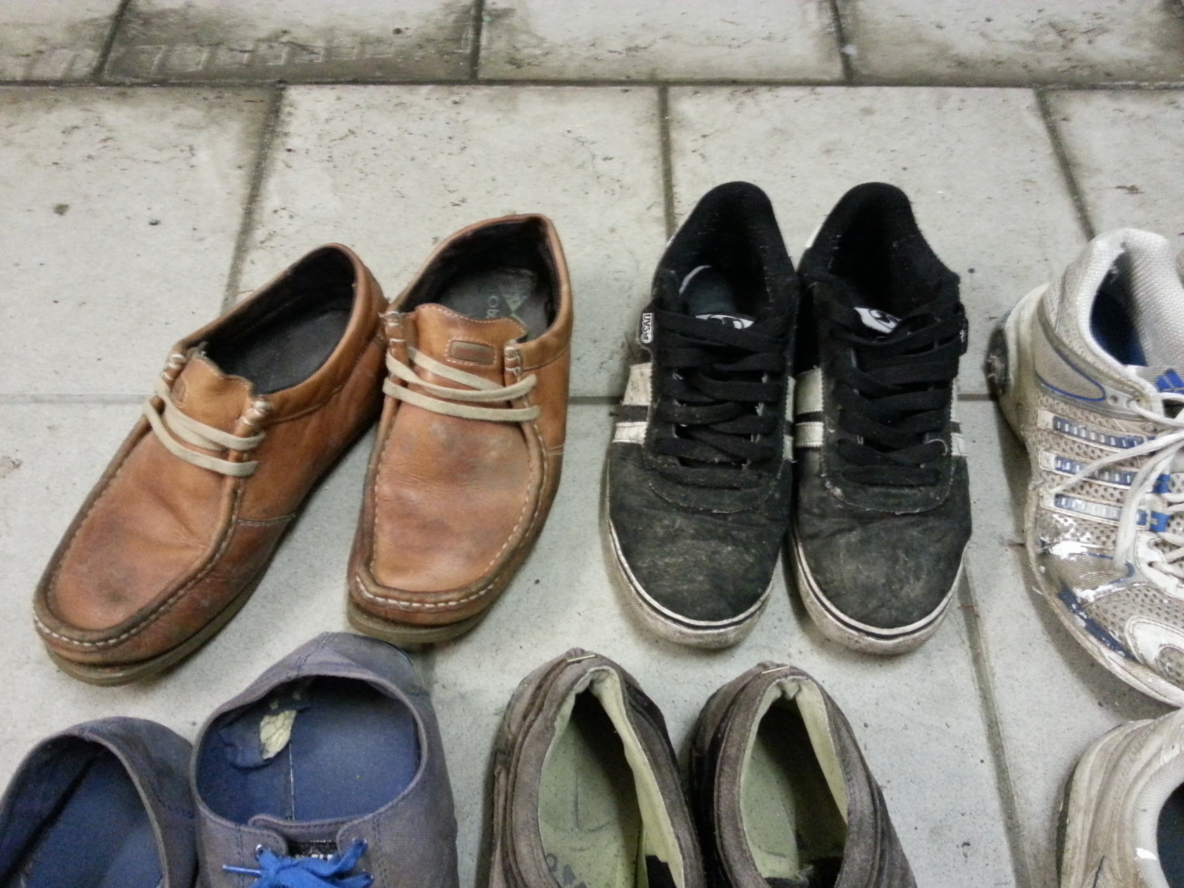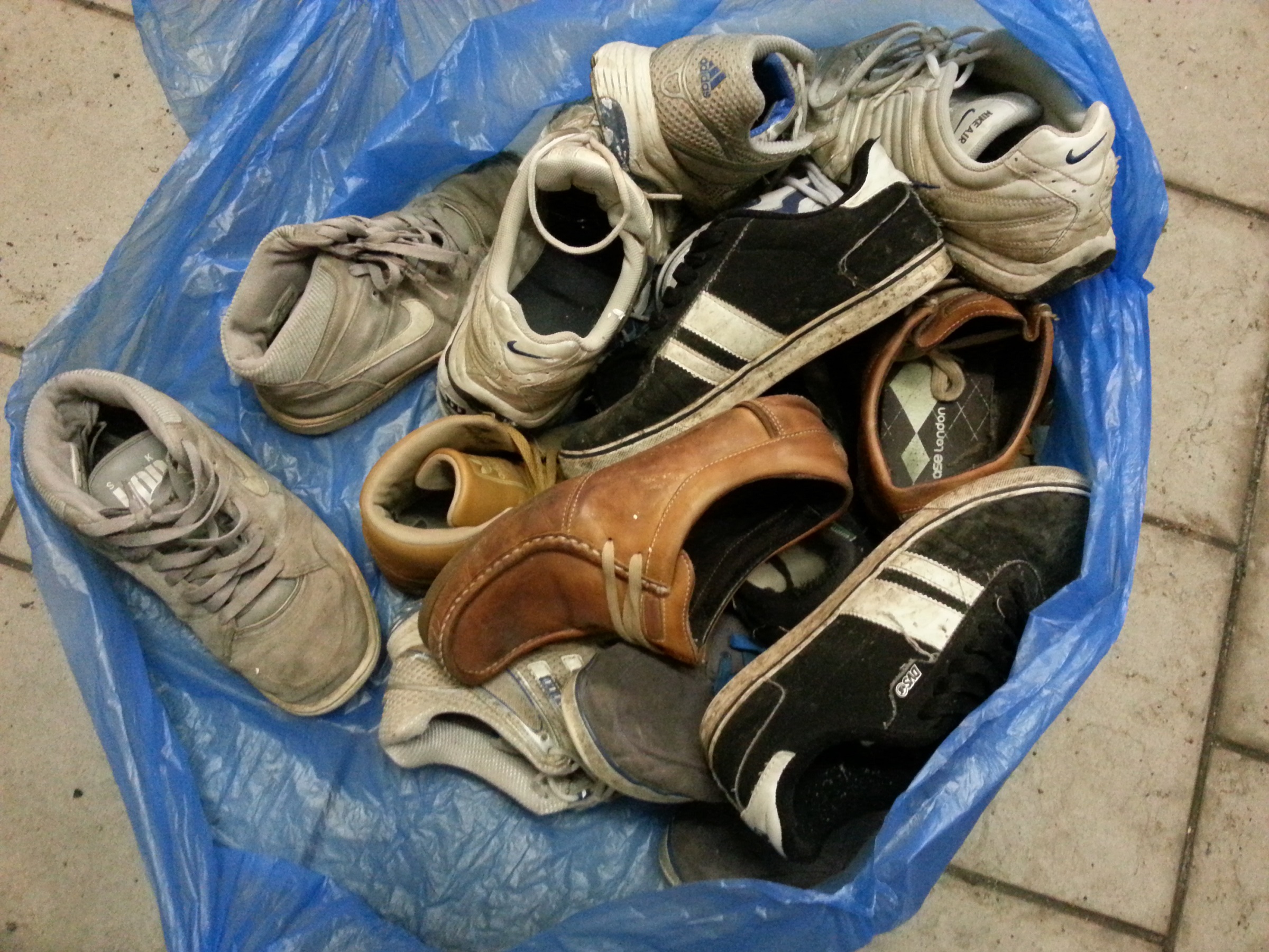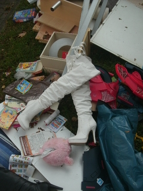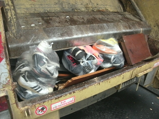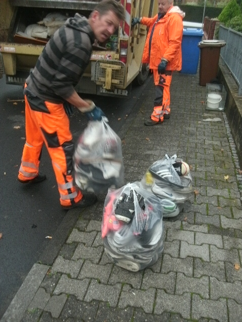 Am frühen gestrigen Morgen saß ich im Auto und beobachtete auf einmal, wie die beiden zur Schule gingen und dabei noch schnell etwas Gerümpel und eben die ausrangierten Schuhe rausstellten zum Sperrmüllabfuhrtermin.