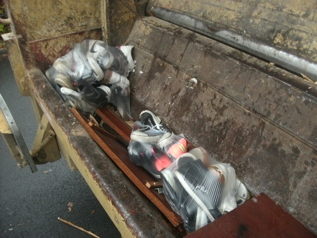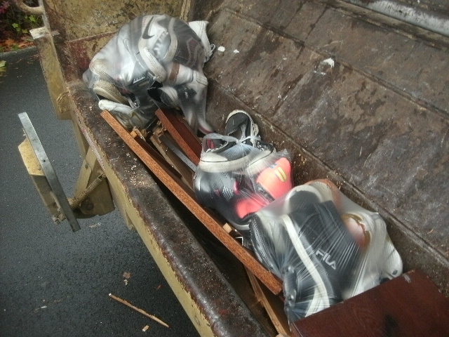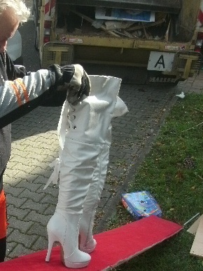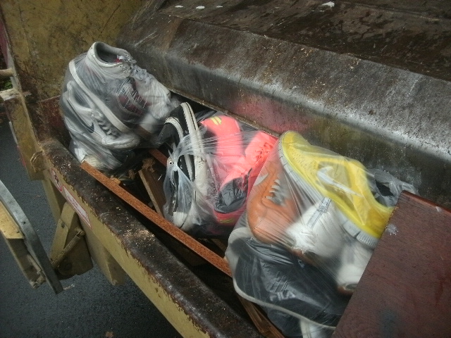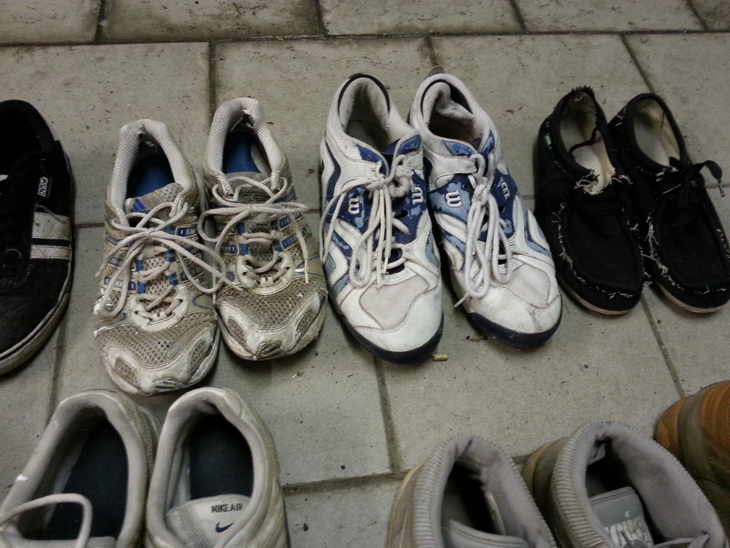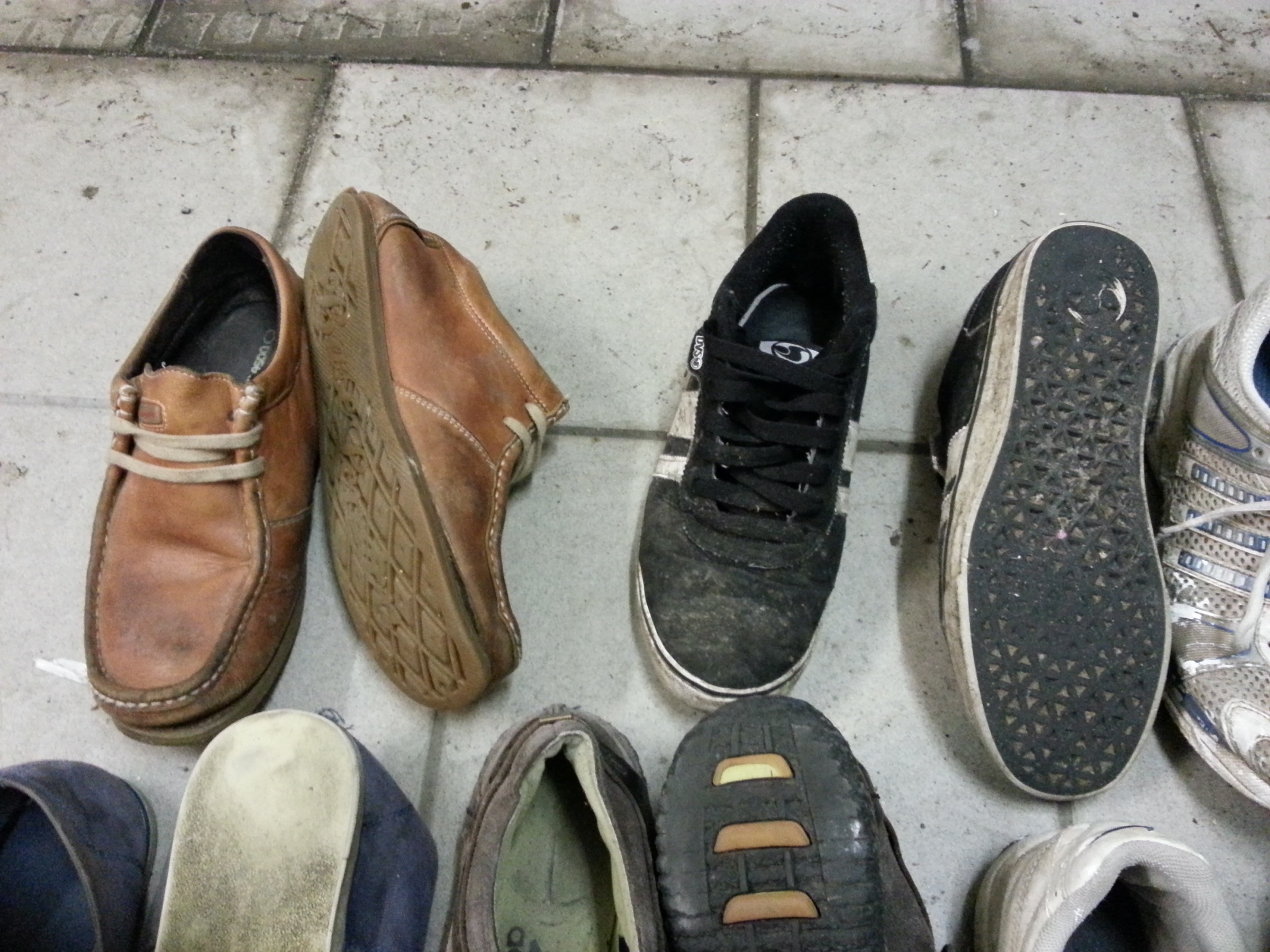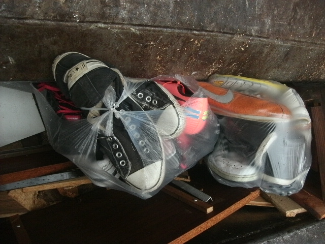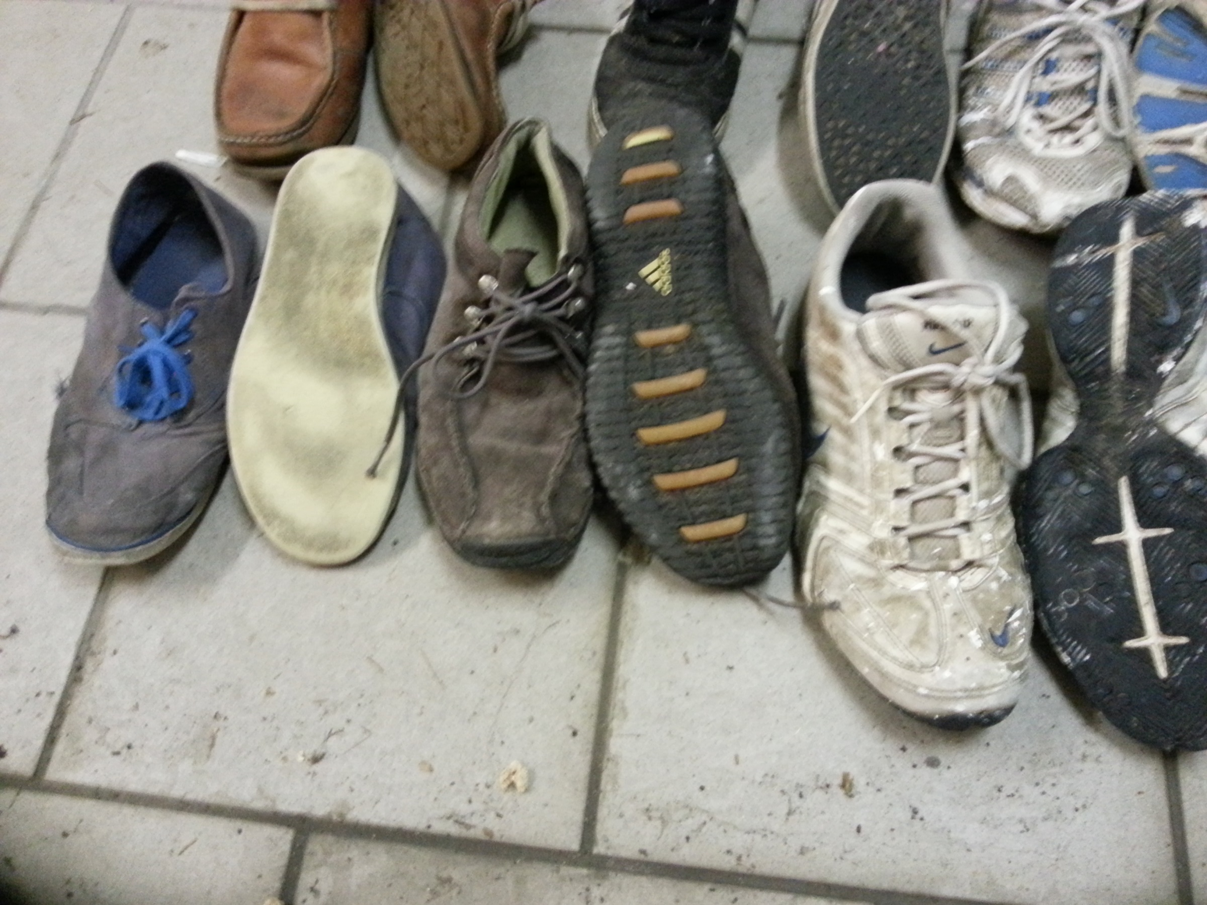 Am frühen gestrigen Morgen saß ich im Auto und beobachtete auf einmal, wie die beiden zur Schule gingen und dabei noch schnell etwas Gerümpel und eben die ausrangierten Schuhe rausstellten zum Sperrmüllabfuhrtermin.