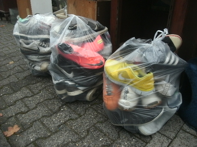 Am frühen gestrigen Morgen saß ich im Auto und beobachtete auf einmal, wie die beiden zur Schule gingen und dabei noch schnell etwas Gerümpel und eben die ausrangierten Schuhe rausstellten zum Sperrmüllabfuhrtermin. 8-)
