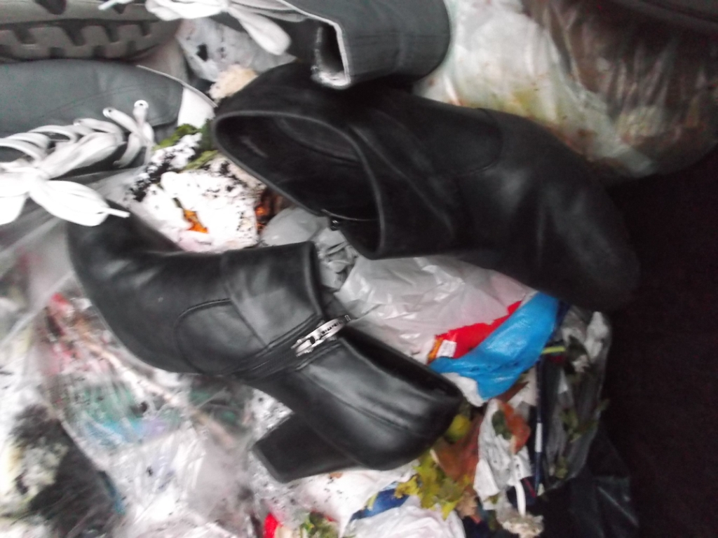 ich hatte heute auch mal glück, das sind die ersten schuhe, die ich aktiv aus dem müll befreien konnte, heute morgen vor der arbeit warf ich noch schnell meinen müllbeutel in unseren container, als der drin war, lies ich mein auge nochmal über den inhalt des containers schweifen, der schon ziemlich voll war, (wird glaube ich auch morgen entleert) und da fiel mir in einem müllbeutel der ganz oben drauf lag, etwas schwarzes auf.