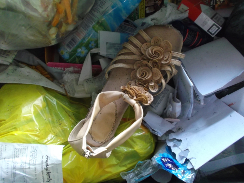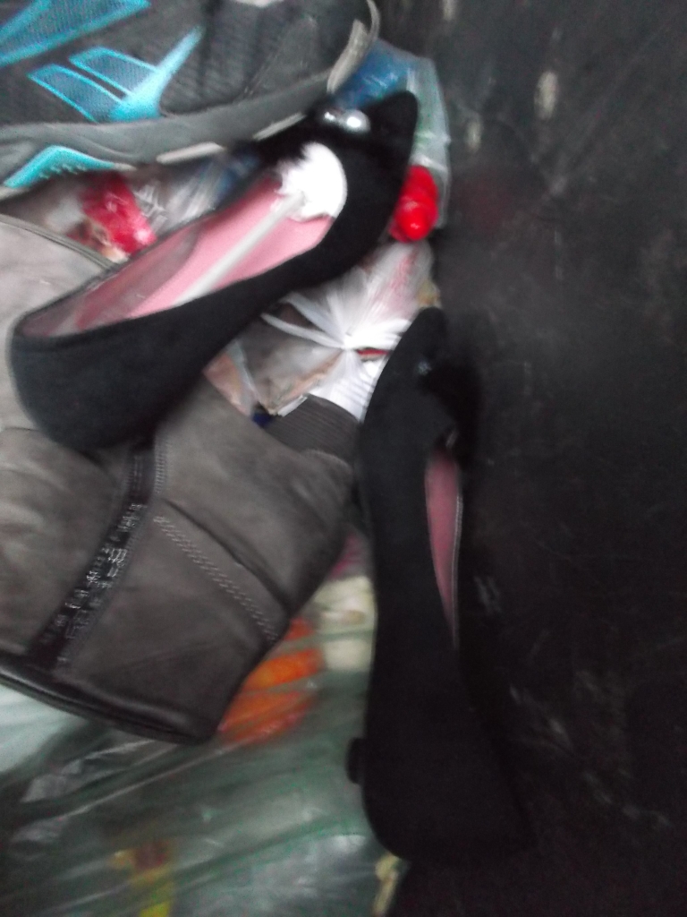 ich tastete also das schwarze ding, war leider was hartes aus plastik, ne duschgelflasche oder so, aber das schwarze daneben war weich und hatte auch die passende form, im ersten moment dachte ich, pumps? also riss ich vorsichtig die tüte auf und hatte einen zerlatschen ballerina meiner nachbarin in der hand, in grösse 36, ich griff dann also noch etwas tiefer und hatte den zweiten in der hand, zum glück war der müll relativ sauber, vielleicht badezimmer und keine eckligen essensreste, also müllgestank gleich null und wie man sieht, war es höchste zeit, dass die zerlatschten kaputten dinger im müll landen, ich wohn übrigens in nem mehrfamilenhaus, da waren schon öfter schuhe im müll, aber bisher nichts, was mich interessiert hätte
