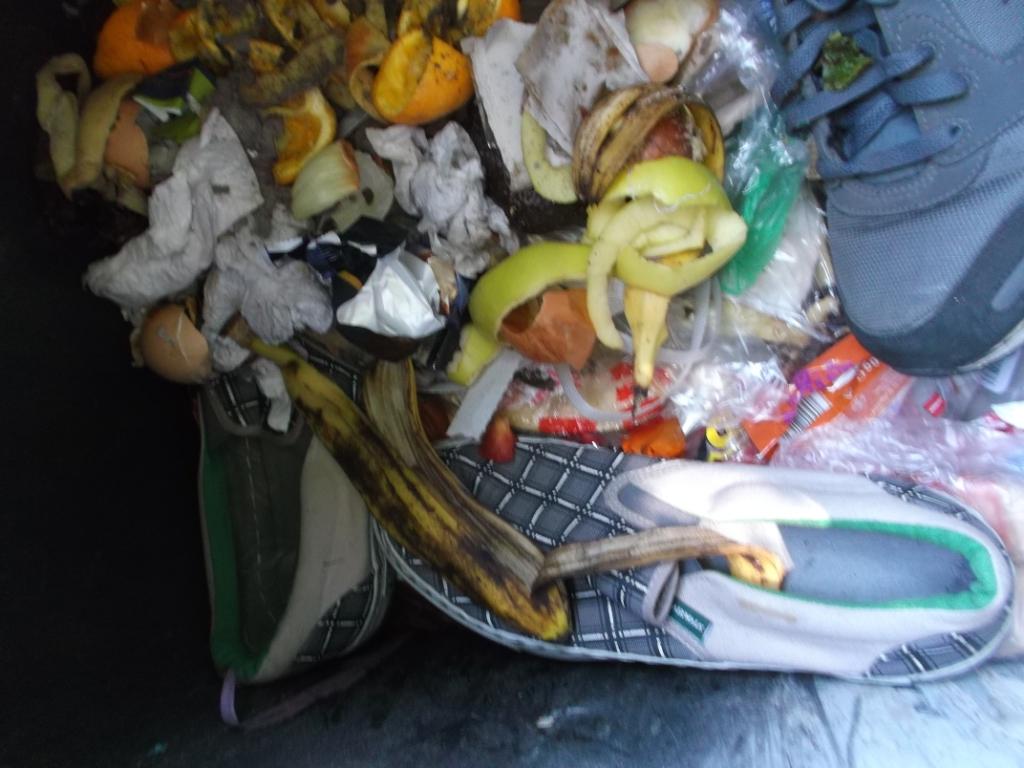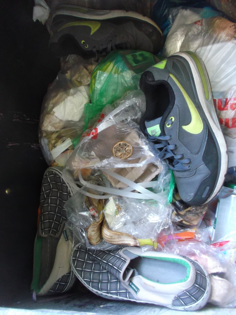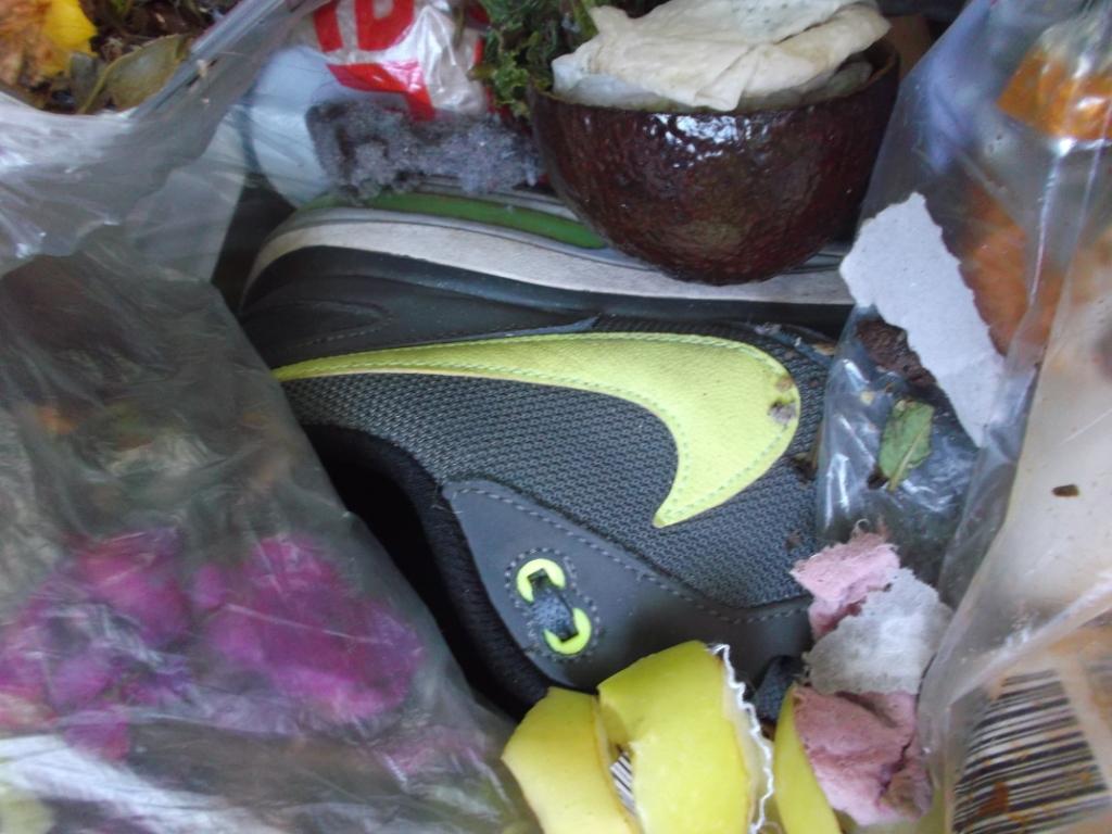 bei dieser Gelegenheit habe ich mal die Kaltblütigkeit besessen zu warten und zu dokumentieren, wie geile Kultsneaks herzlos von den Mitbewohnern mit ihrem Müll verschüttet wurden; keine Rettung, nichtmal ein kurzes Herausnehmen und Prüfen. Für die vielen Mitbewohner waren die beiden Sneakerpaare genau so "Igitt" bzw. "wertlos" wie eine faule Bananenschale oder abgenagte Knochen. Entsprechend auch diese nun folgende Vermüllung: